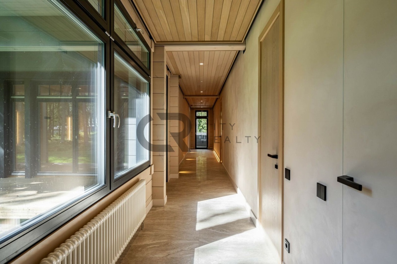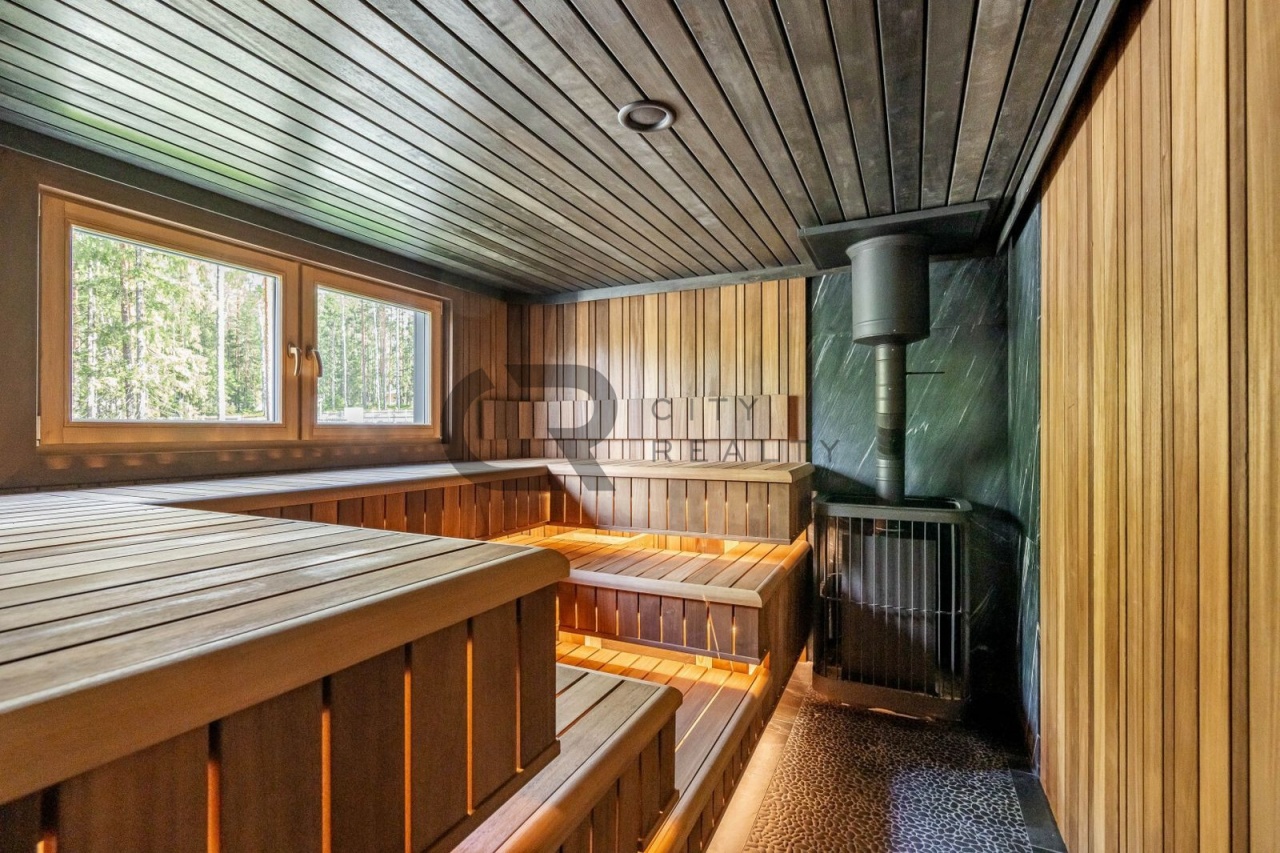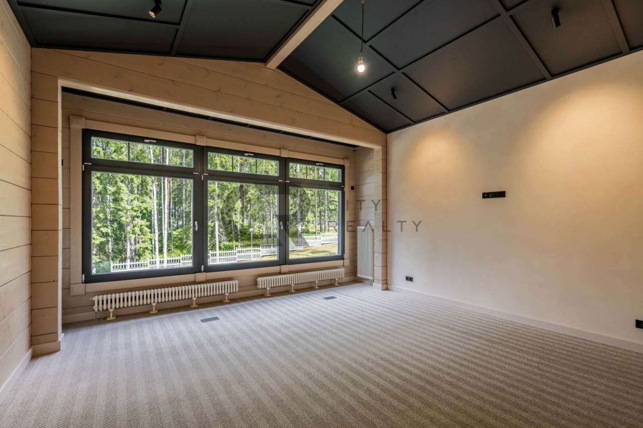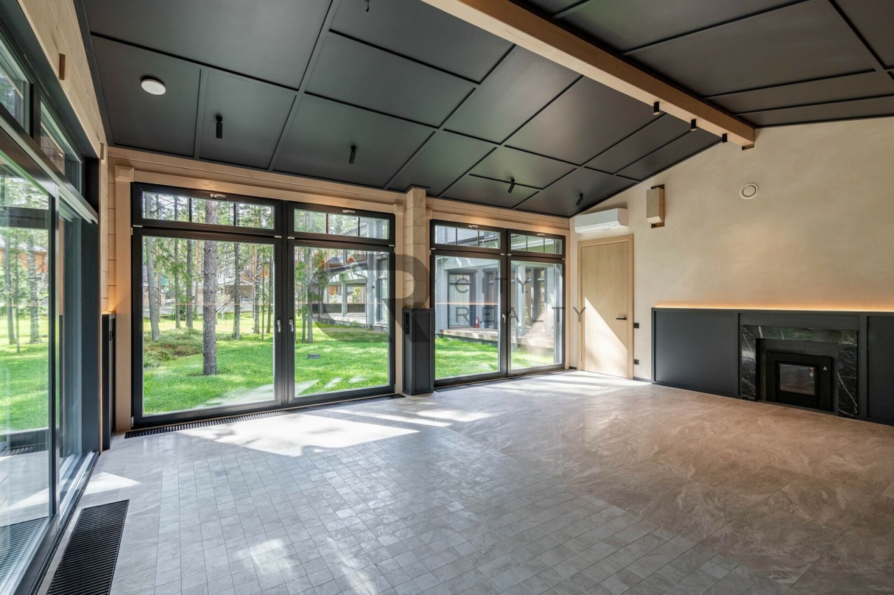 Ландшафт передает первозданную красоту, на участке есть собственный черничник, сохранены многолетние сосны, вид на которые открывается из панорамных окон гостиной. Есть возможность заказать мебель по дизайн проекту.