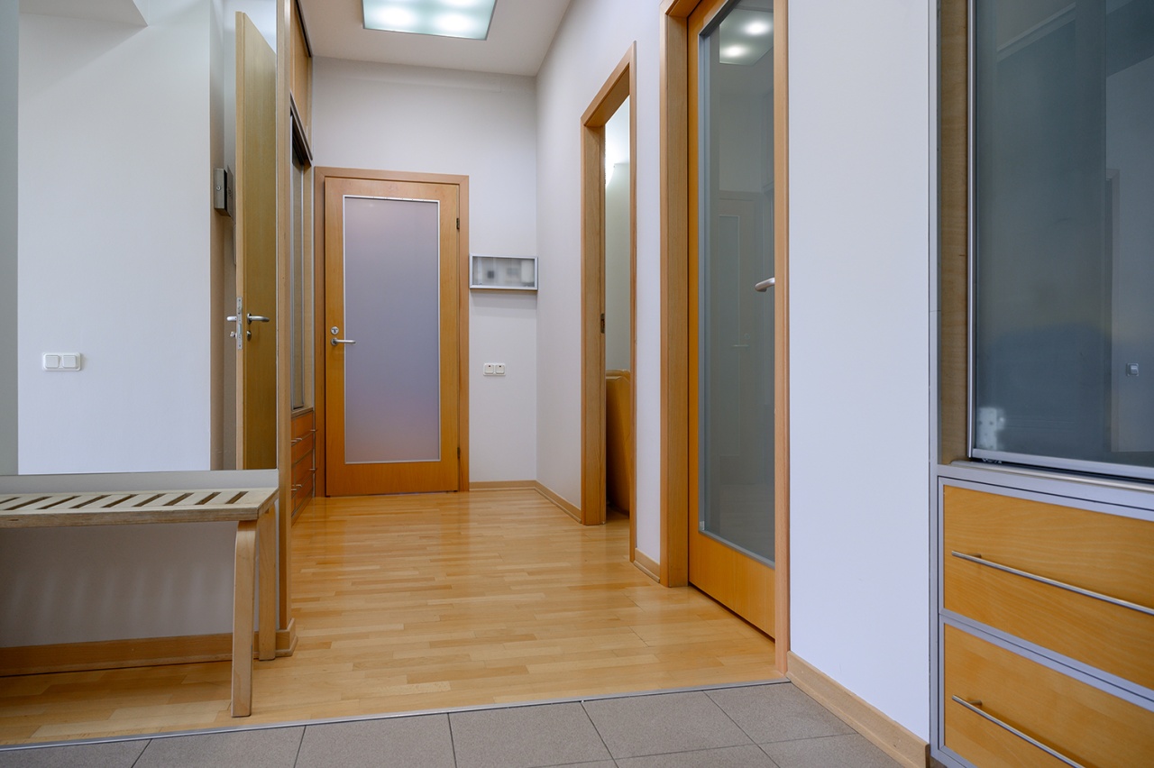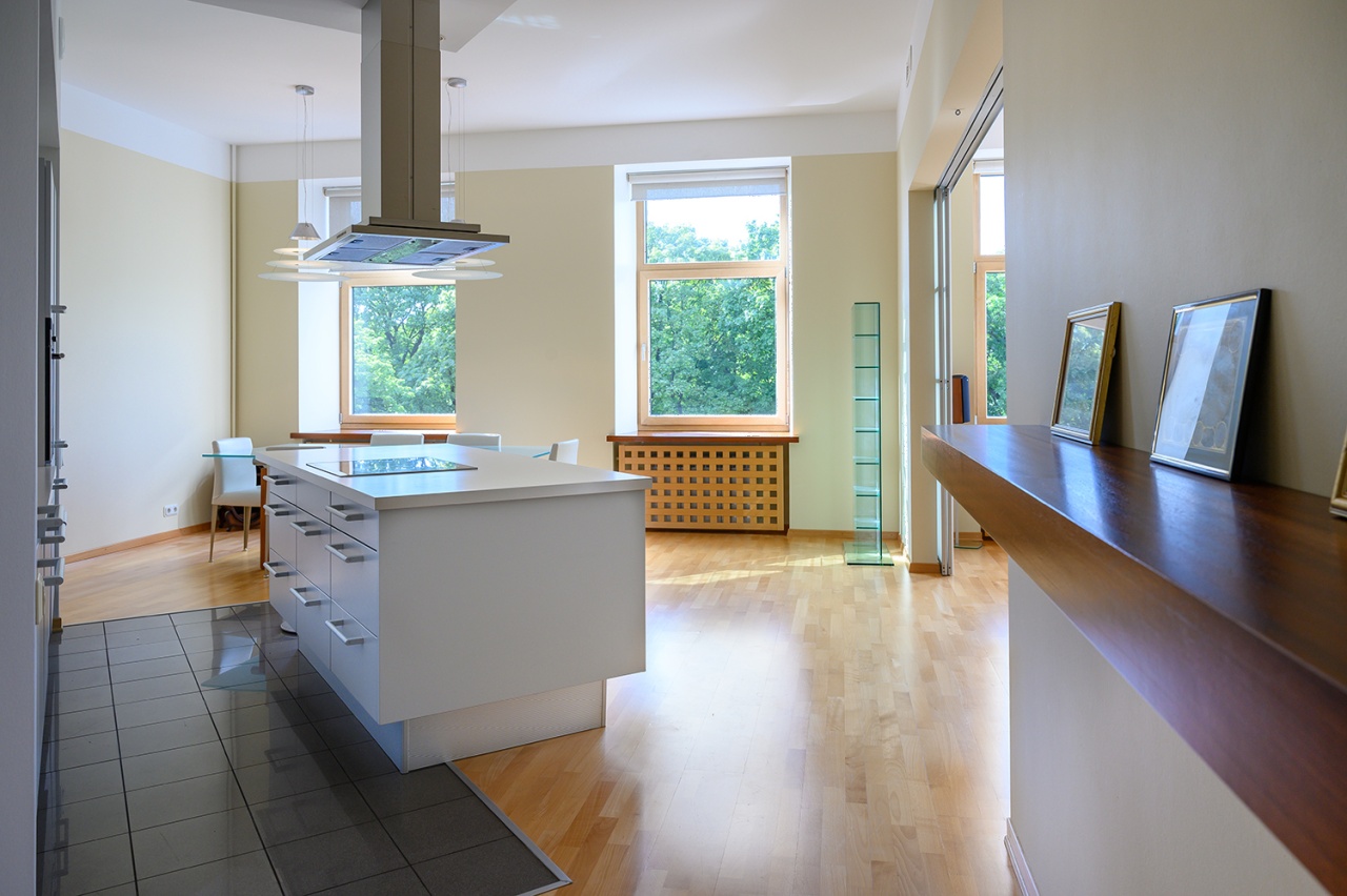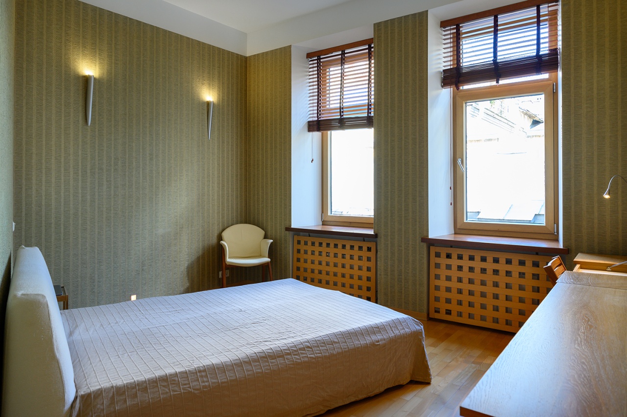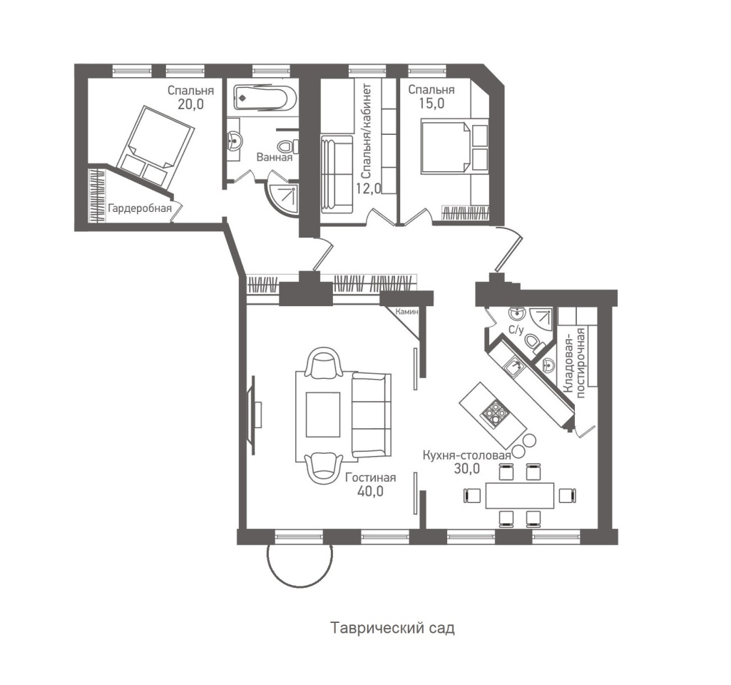 Общая площадь квартиры 160 кв. м. На ней разместились просторная гостиная с камином и выходом на небольшой балкон (40 кв. м), соединенная с ней кухня-столовая (30 кв. м), основная спальня с гардеробной (20 кв. м), вторая спальня (15 кв. м) и спальня-кабинет (12 кв. м), а также 2 ванные комнаты (душевая при входе и основная ванная комната с окном, гидромассажной ванной и душевой кабиной). Из окон кухни и гостиной открываются великолепные виды на Таврический сад и Таврический дворец.