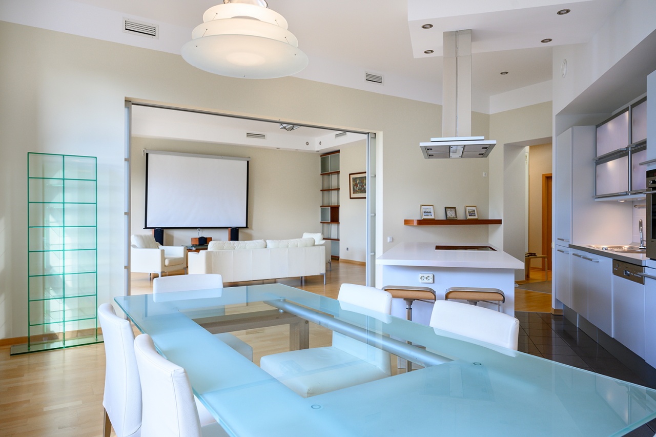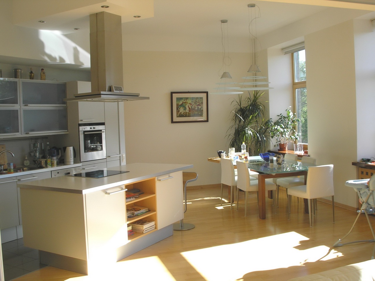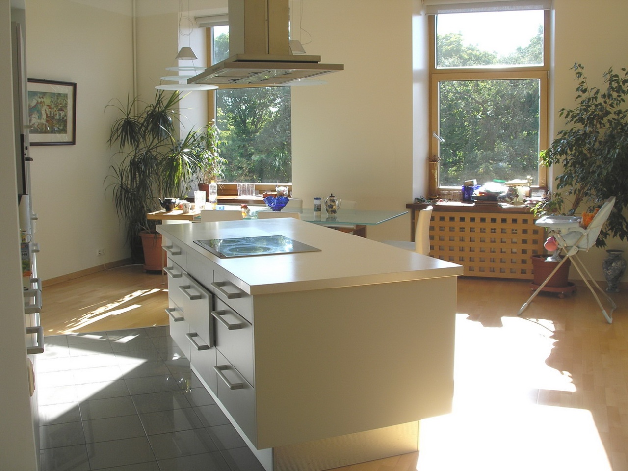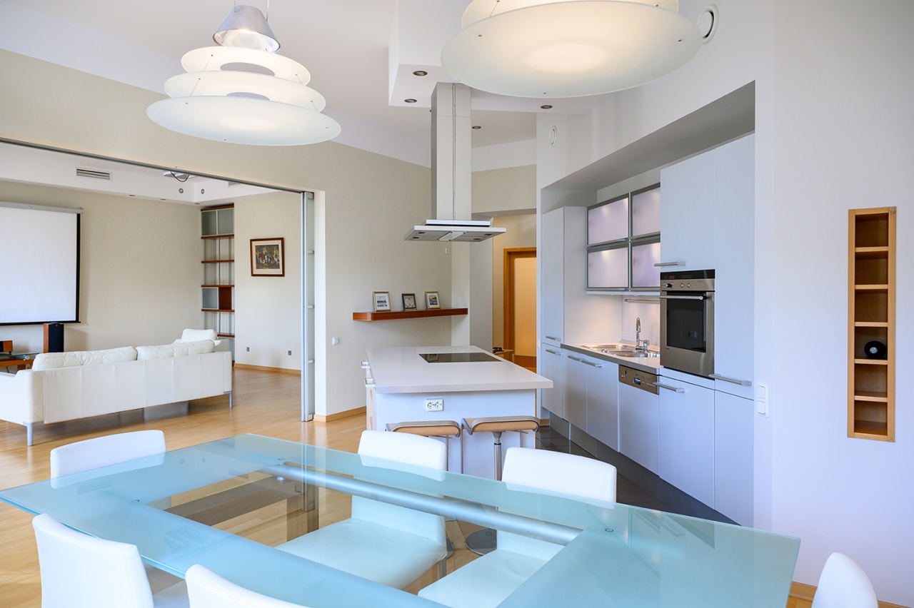 Мебель от топовых мировых производителей (Rolf Benz, B&B Italia) и сделанная на заказ для этой квартиры. Кухонная мебель Poggen Pohl — это один из лучших производителей кухонной мебели в Германии. Вся необходимая кухонная и другая бытовая техника Bosch, Siemens, Gaggenau, Liebherr. Приточно-вытяжная вентиляция и система кондиционирования по всей квартире. Встроенные шкафы. Электрический подогрев полов в зонах с кафельным покрытием.