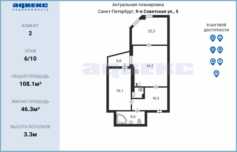 | Этаж | 6 | Общая площадь | 108.1 кв.м. |