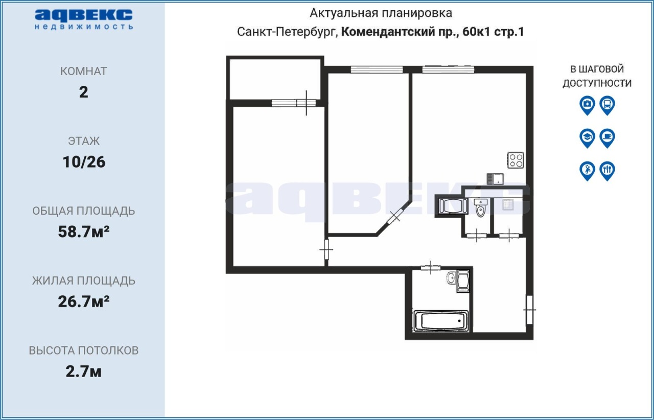 | Этаж | 10 | Общая площадь | 58.7 кв.м. |
