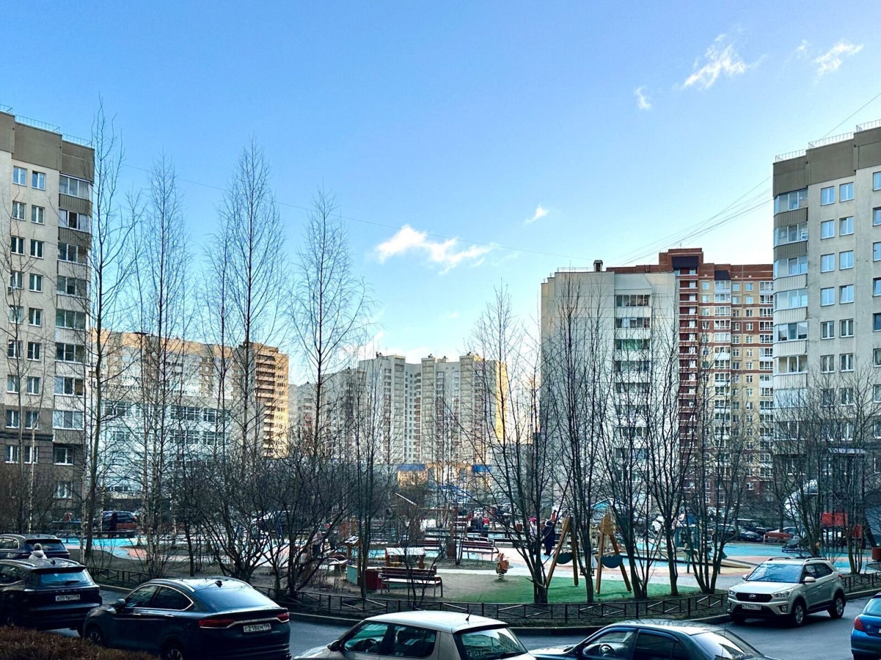 Окна выходят в большой двор с благоустроенной, по последнему слову, детской площадкой и красивыми зелёными насаждениями. Рядом приличная гимназия № 540.