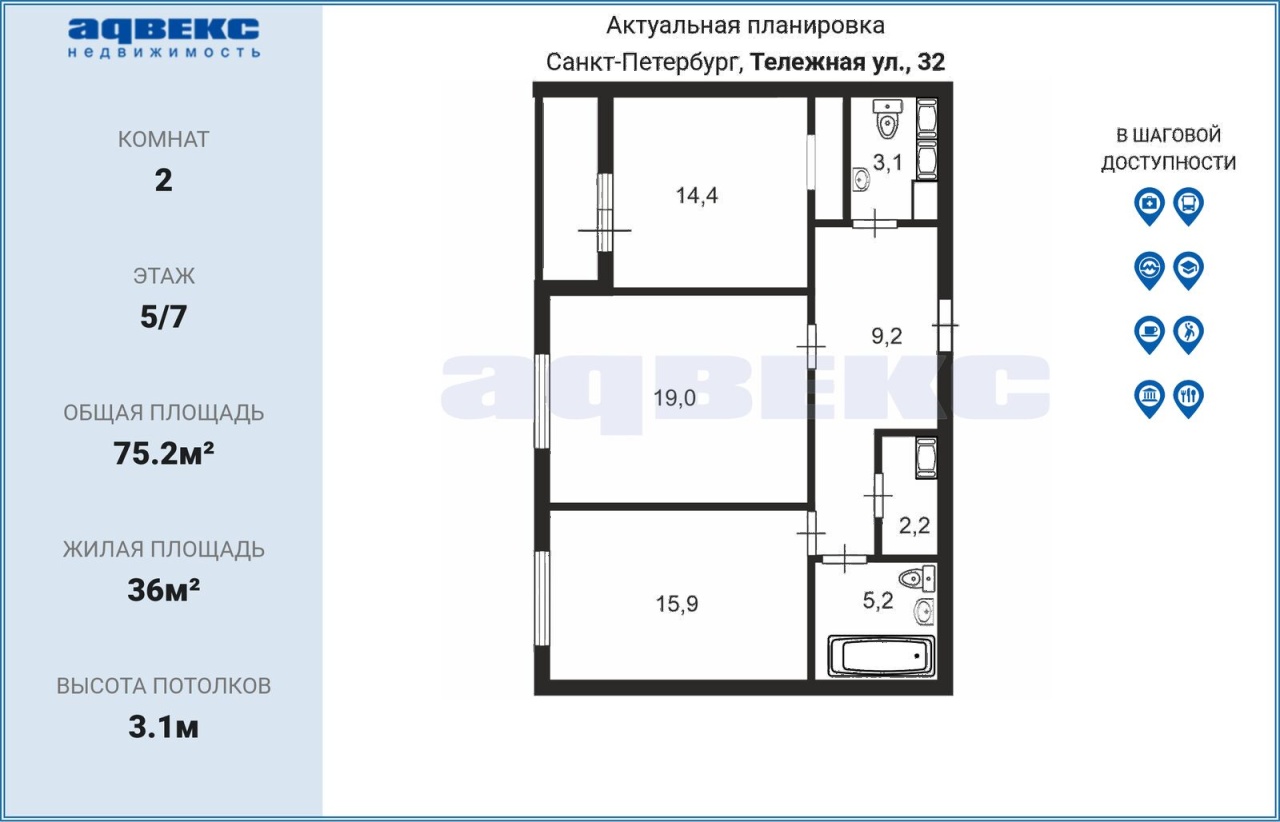 | Этаж | 5 | Общая площадь | 75.2 кв.м. |