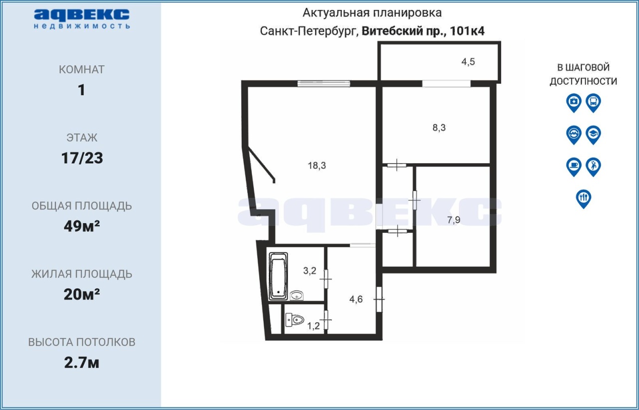 | Этаж | 17 | Общая площадь | 49 кв.м. |