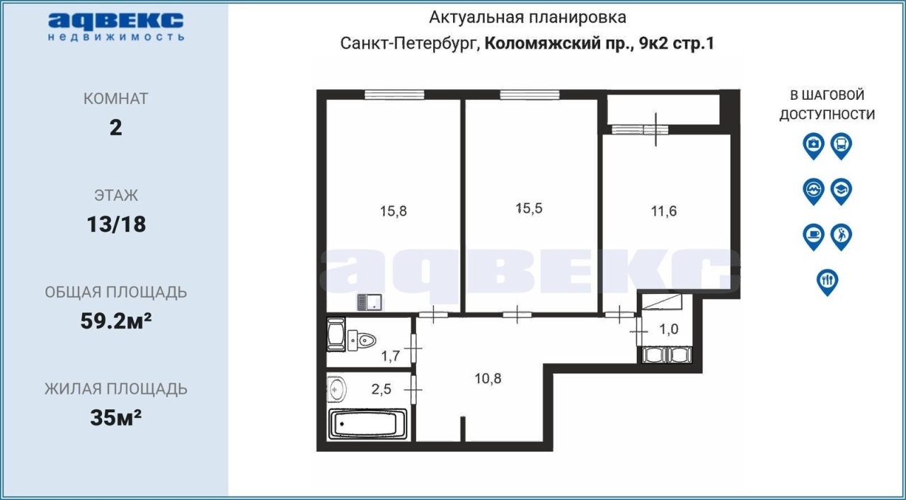 Этаж 13 Общая площадь 59.2 кв.м.