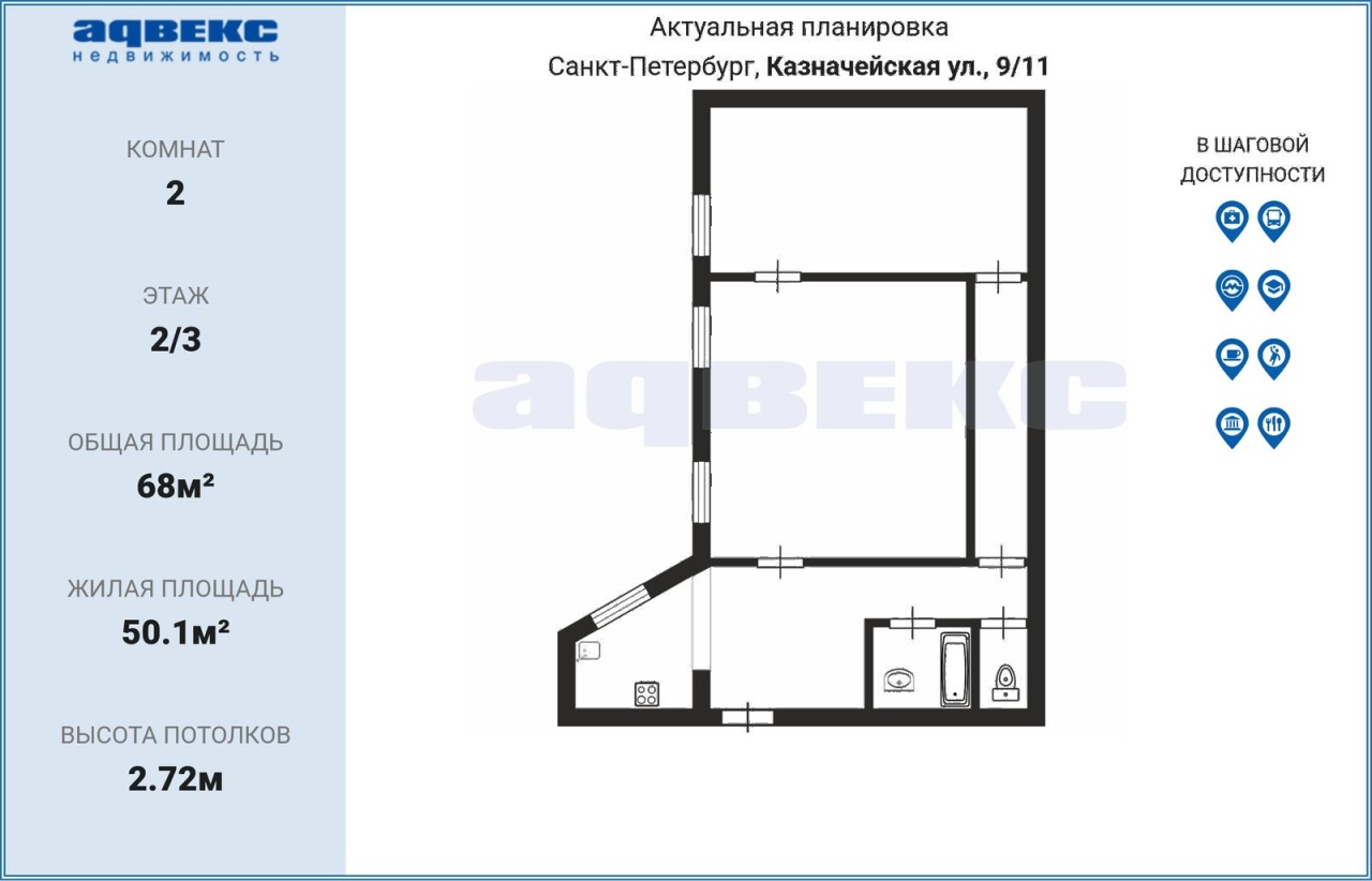 Жилая площадь 50.1 кв.м. Число комнат 2