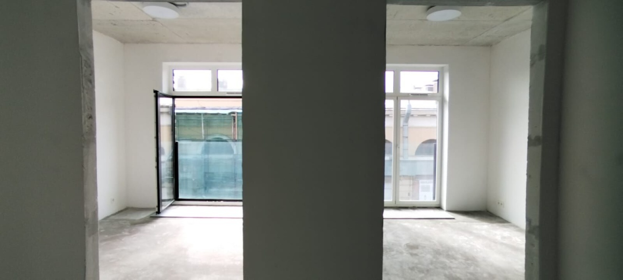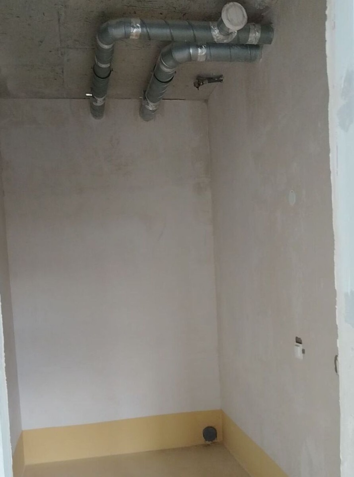 Подчистовая отделка, стяжка, отштукатуренные стены, гидроизоляция, конвекторы двери