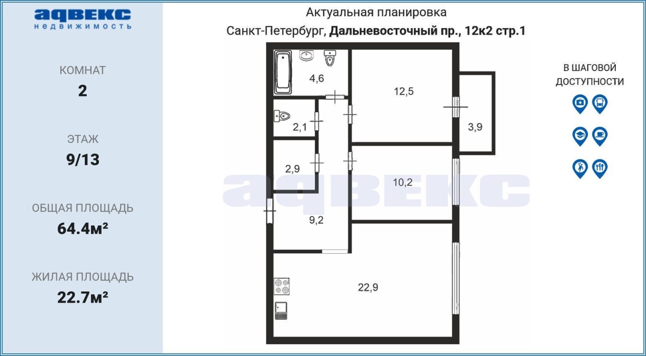 Этаж | 9 | Общая площадь | 64.4 кв.м. |