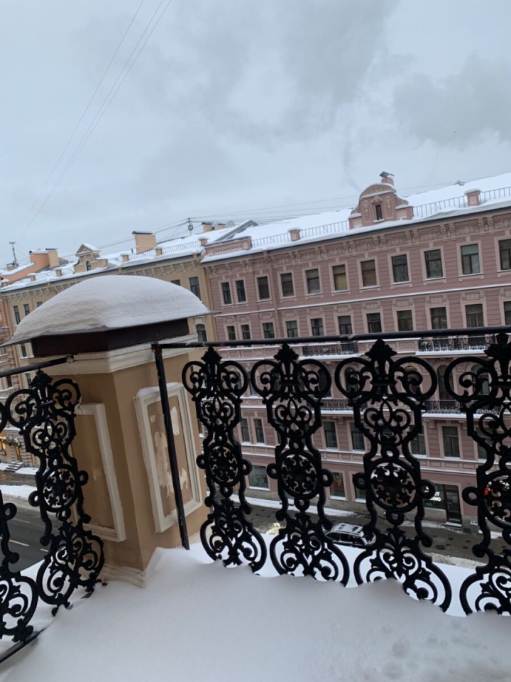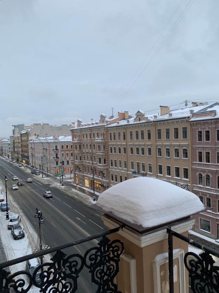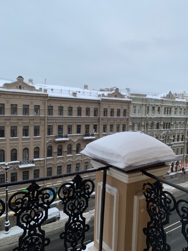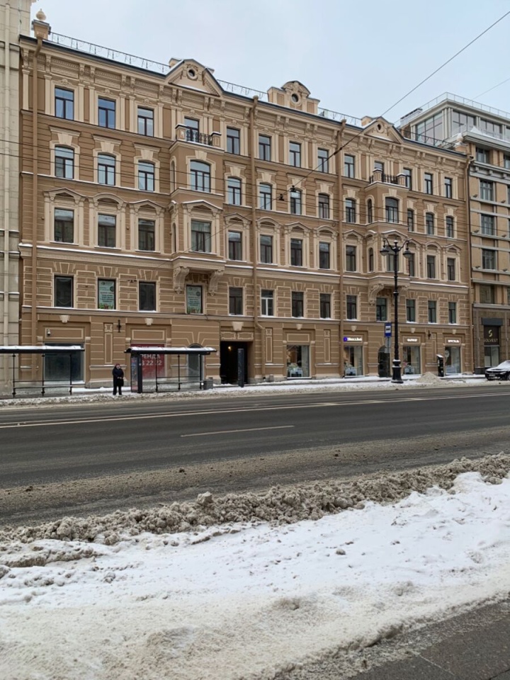 Квартира с роскошным балконом расположенная на 5 этаже пятиэтажного кирпичного дома. Общая площадь - 140.5 кв. м. Жилая площадь - 98.8 кв. м. Кухня - 12.7 кв. м. Раздельный санузел. Высота потолков - 3.2 м. Панорамные виды на Невский проспект