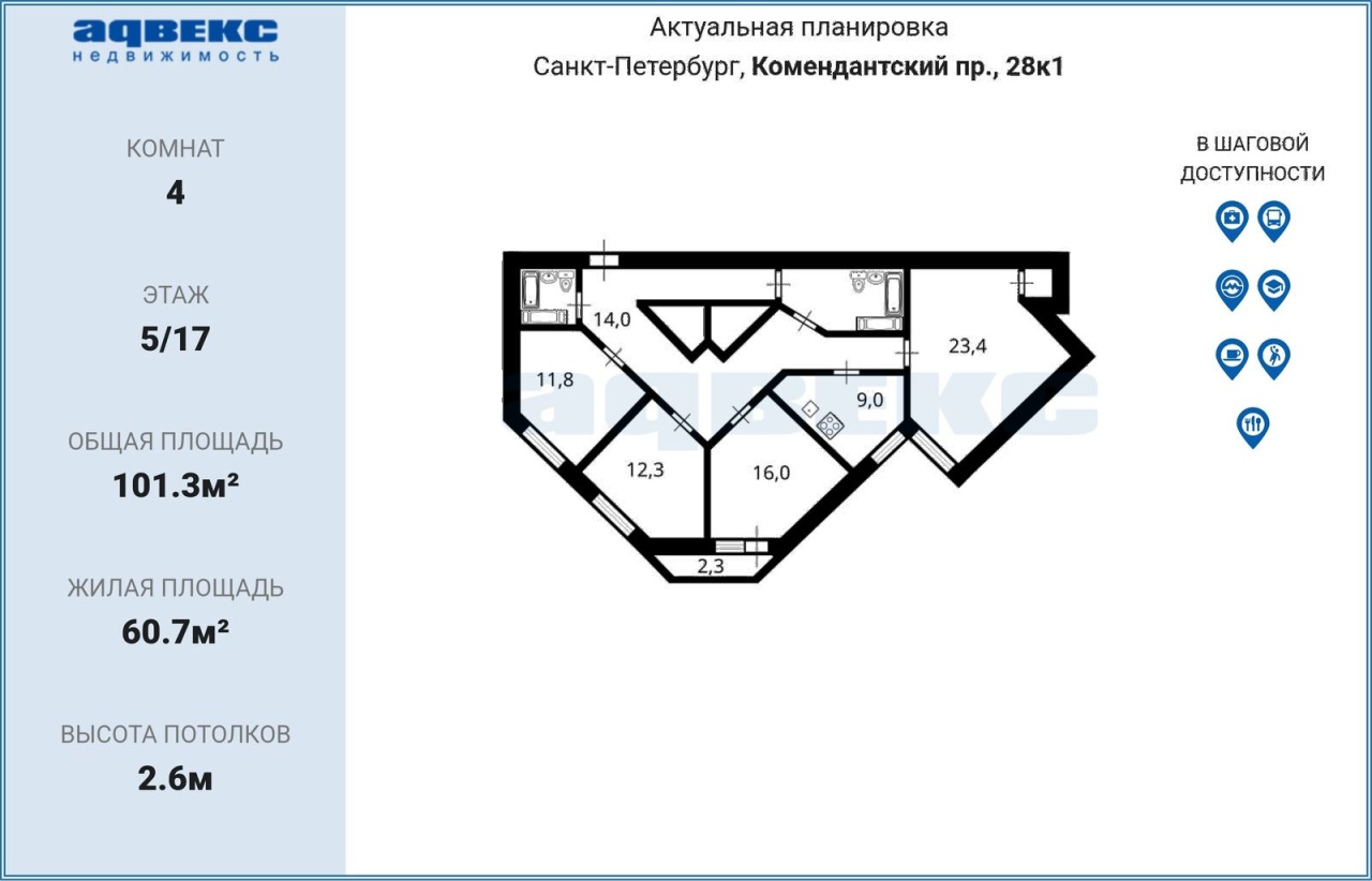 Этаж | 5 | Общая площадь | 101.3 кв.м. |