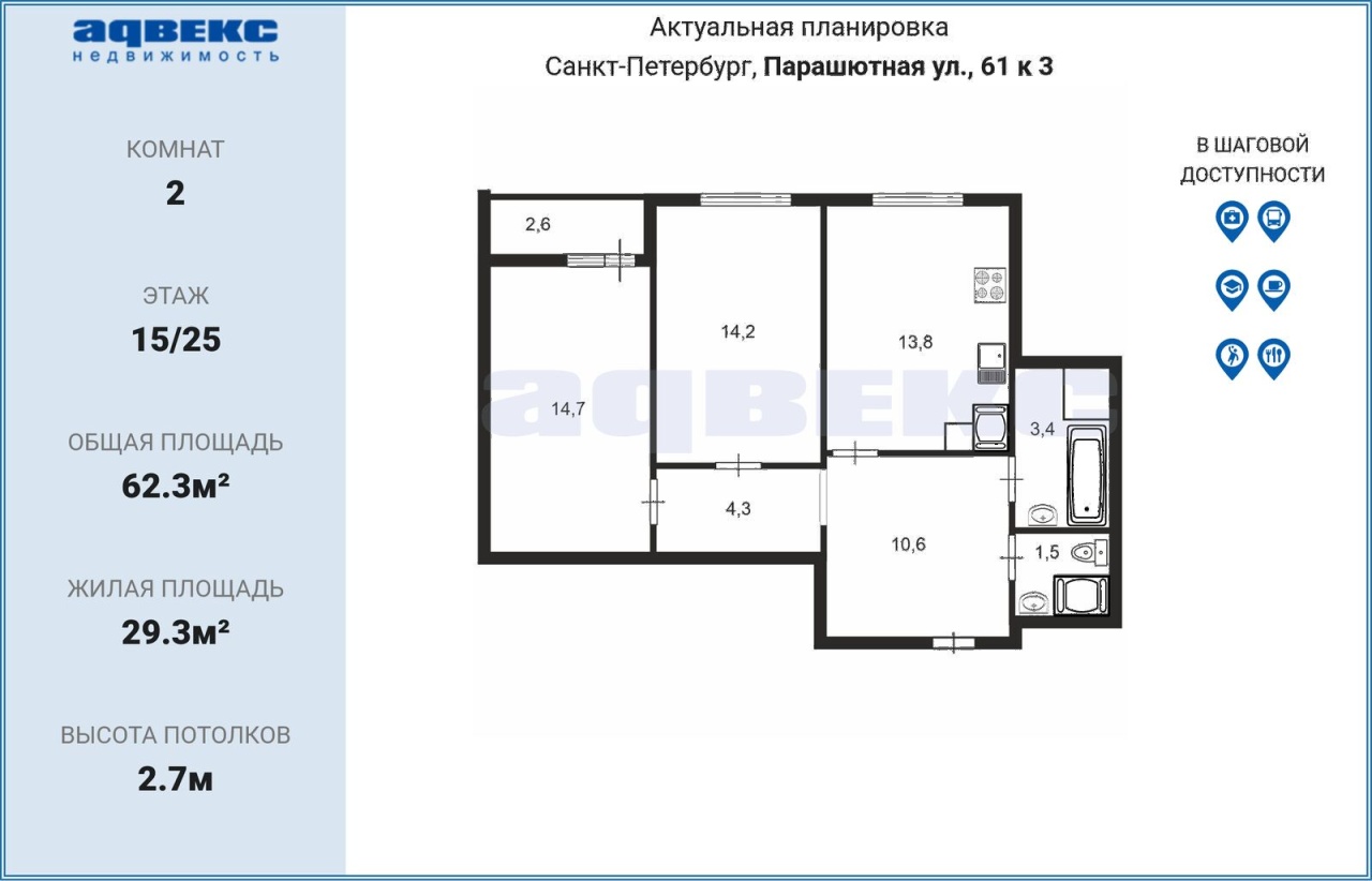 Этаж 15 Общая площадь 62.3 кв.м.