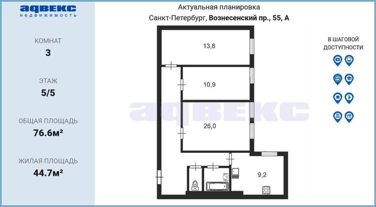 Этаж | 5 | Общая площадь | 76.6 кв.м. |