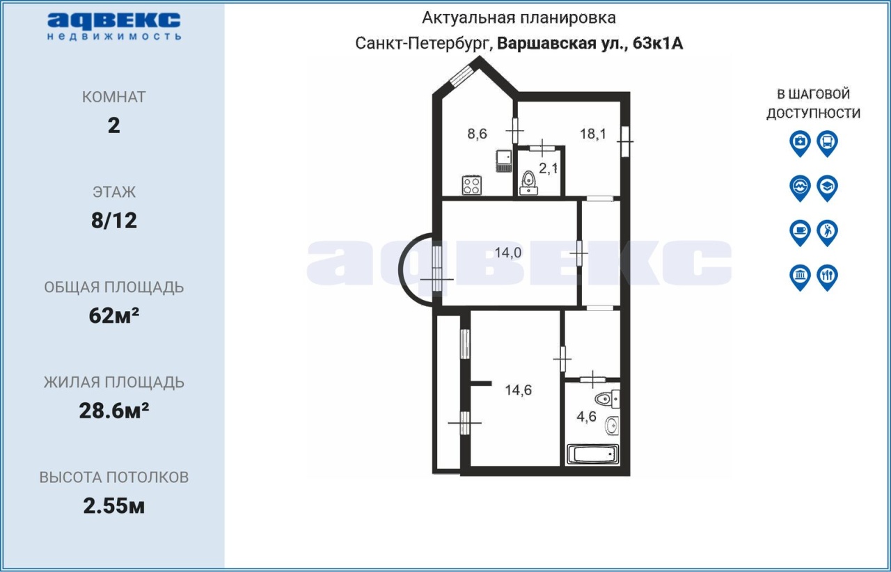 Этаж | 8 | Общая площадь | 62 кв.м. |