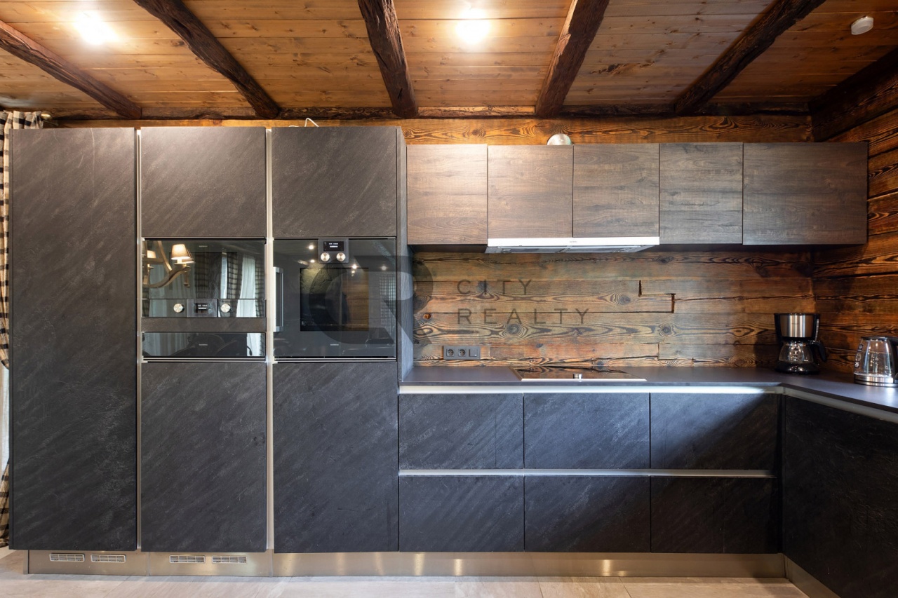 На первом этаже расположены просторная гостиная с камином и кухня со встроенной мебелью и всей необходимой качественной техникой; санузел.