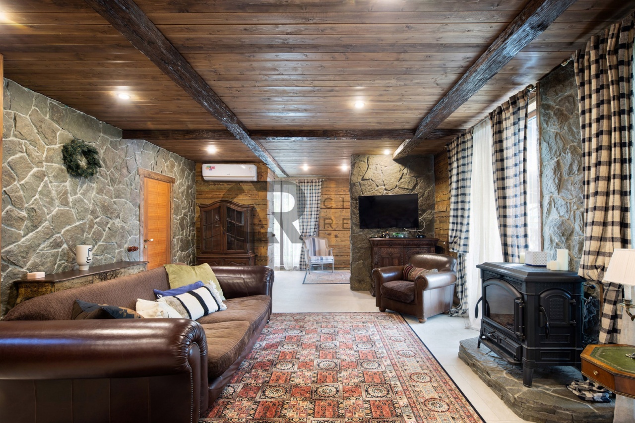 На первом этаже - гостиная с большим дровяными камином; санузел.