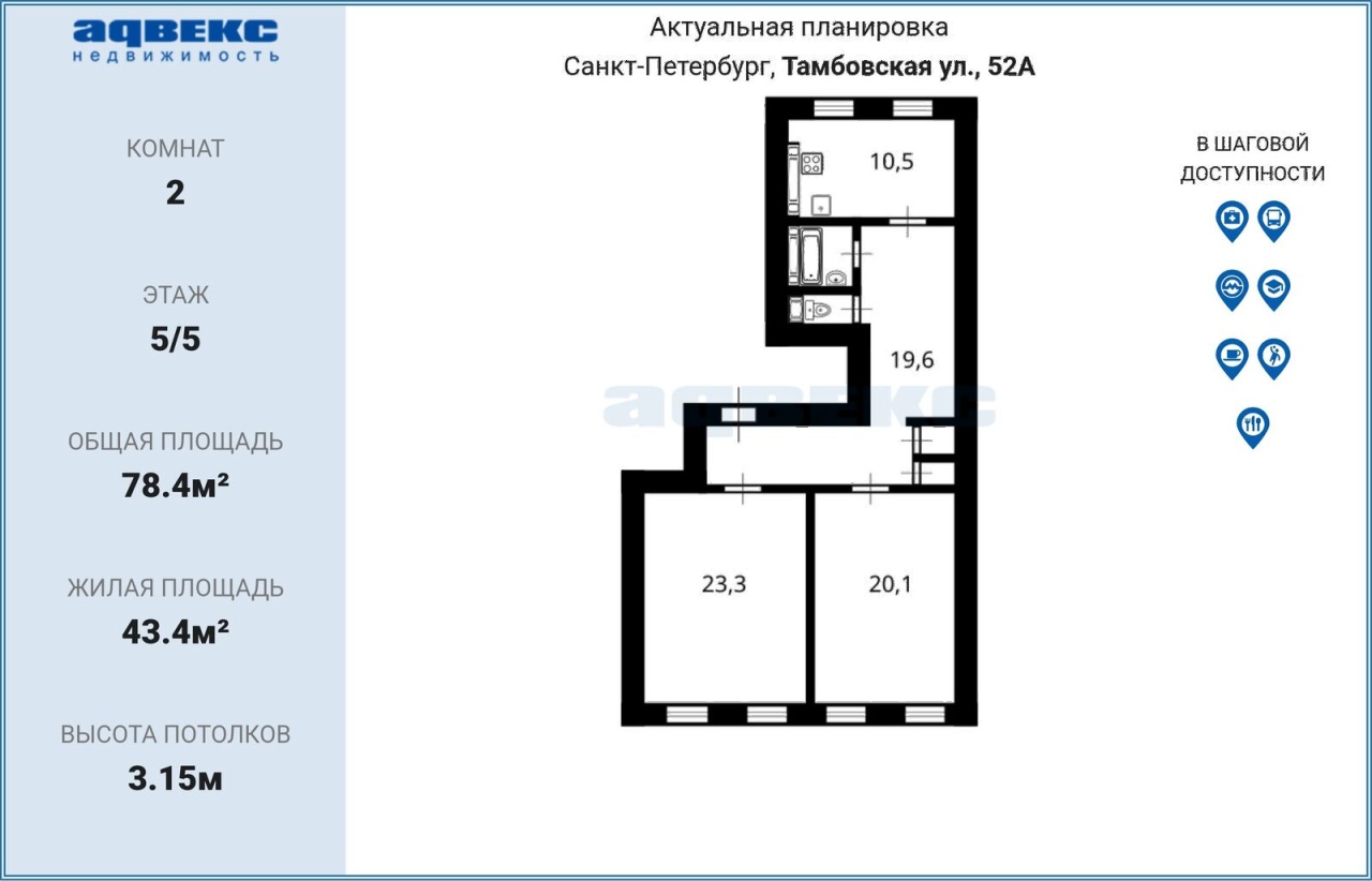| Этаж | 5 | Общая площадь | 78.4 кв.м. |