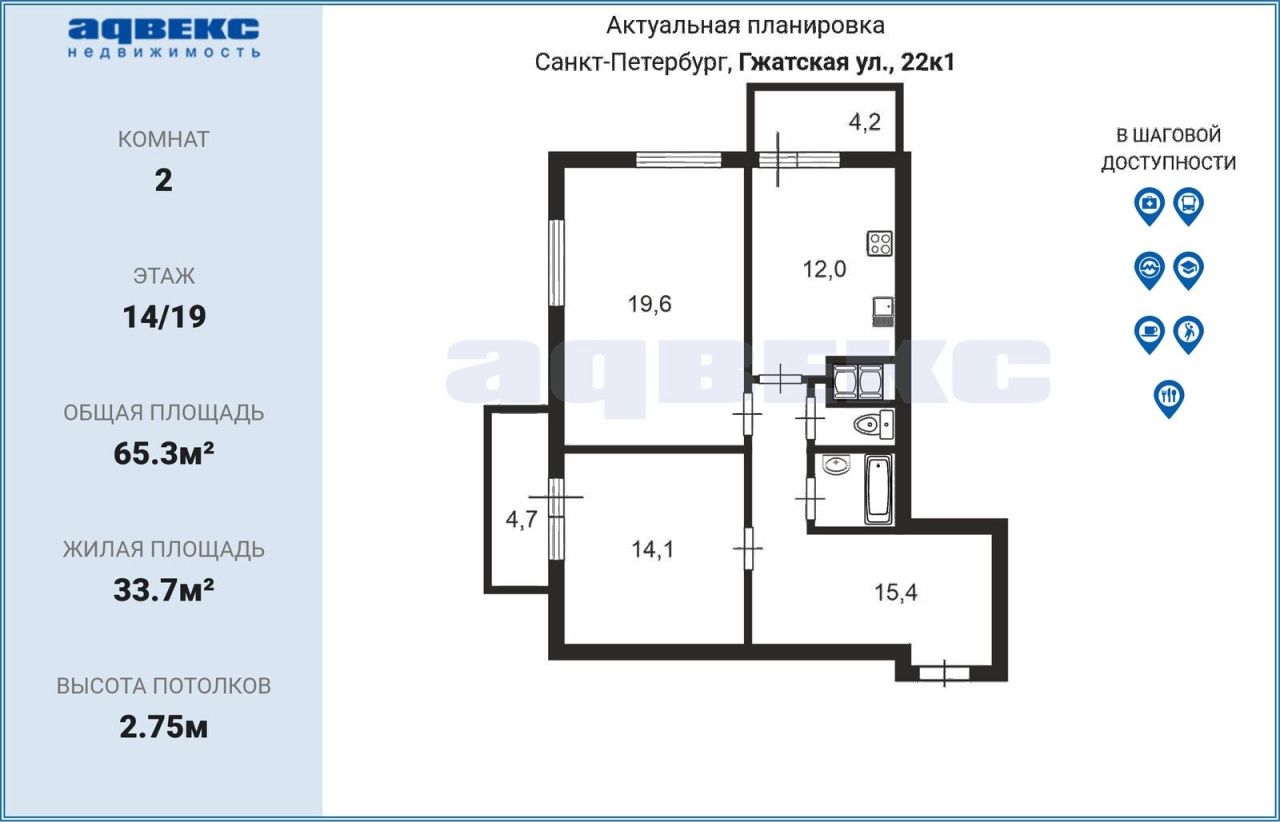 | Этаж | 14 | Общая площадь | 65.3 кв.м. |