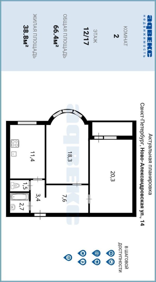 | Этаж | 12 | Общая площадь | 66.4 кв.м. |