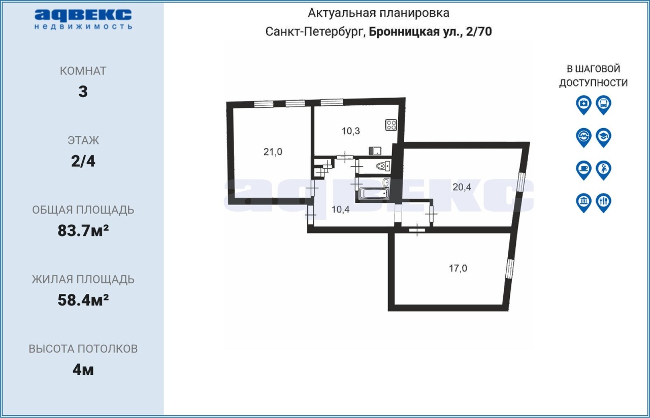 Продается 3-х комнатная квартира общей площадью 83.7 кв. м и кухней 10.3 кв. Квартира расположена на 2 этаже 4-х этажного кирпичного дома в шаговой доступность 7 станций метрополитена: