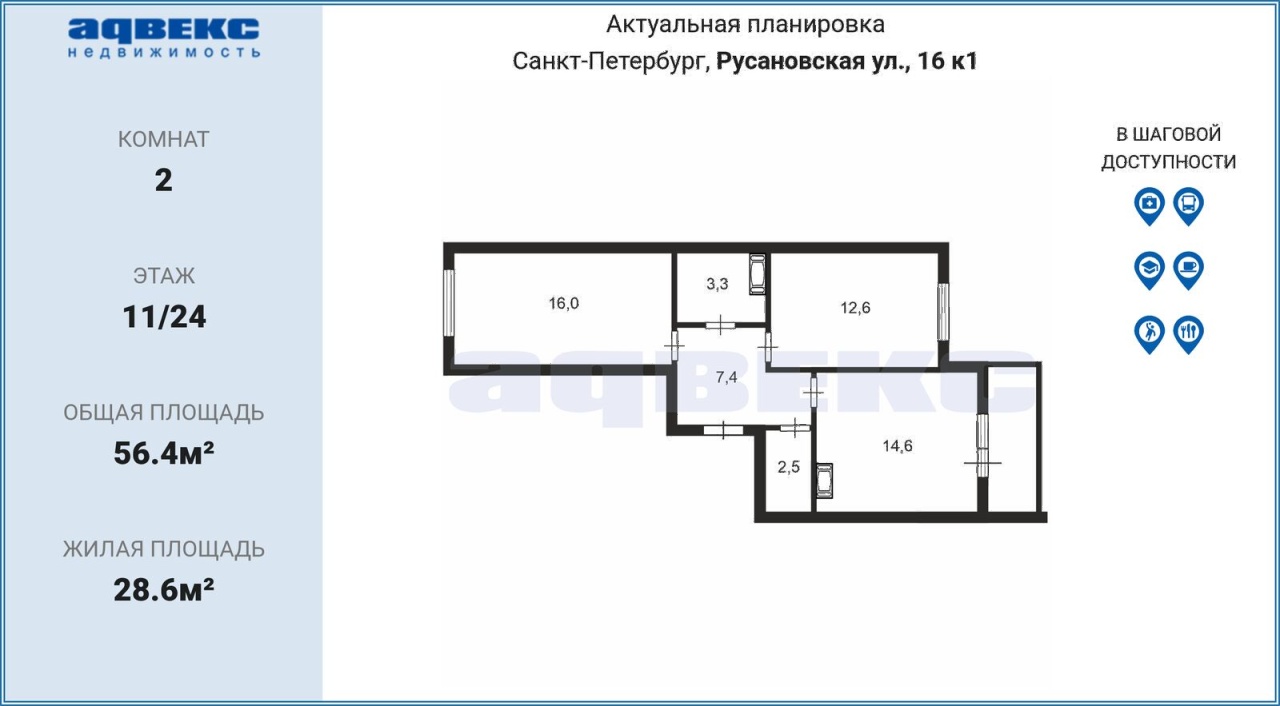 | Этаж | 11 | Общая площадь | 56.4 кв.м. |