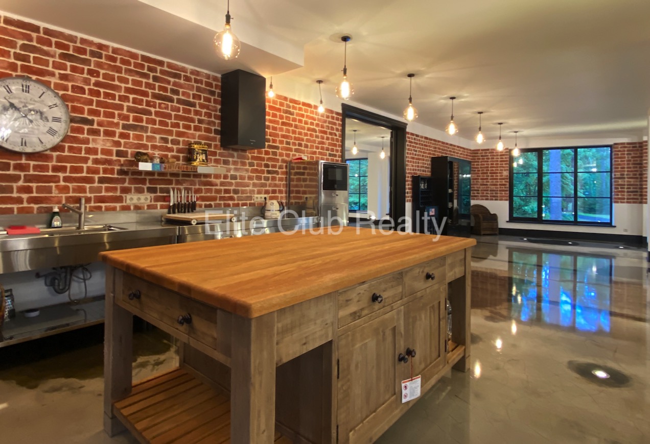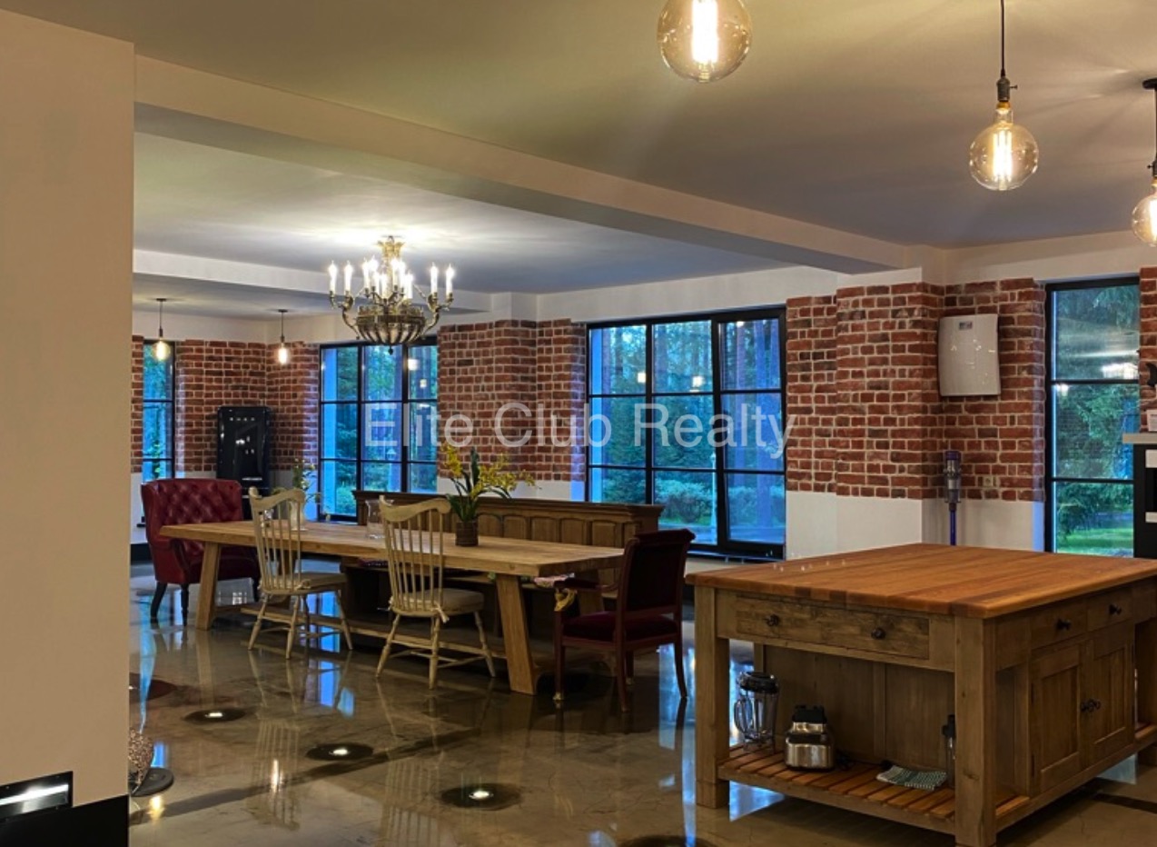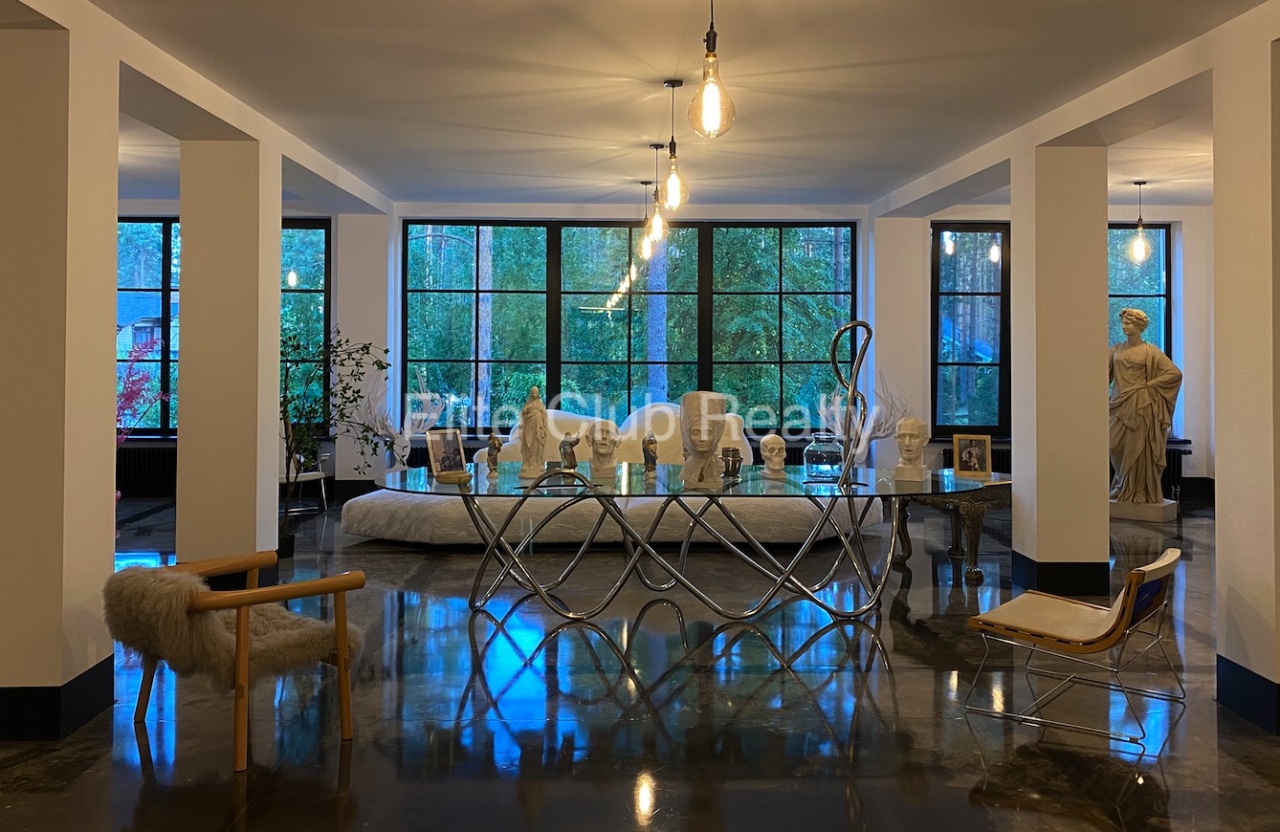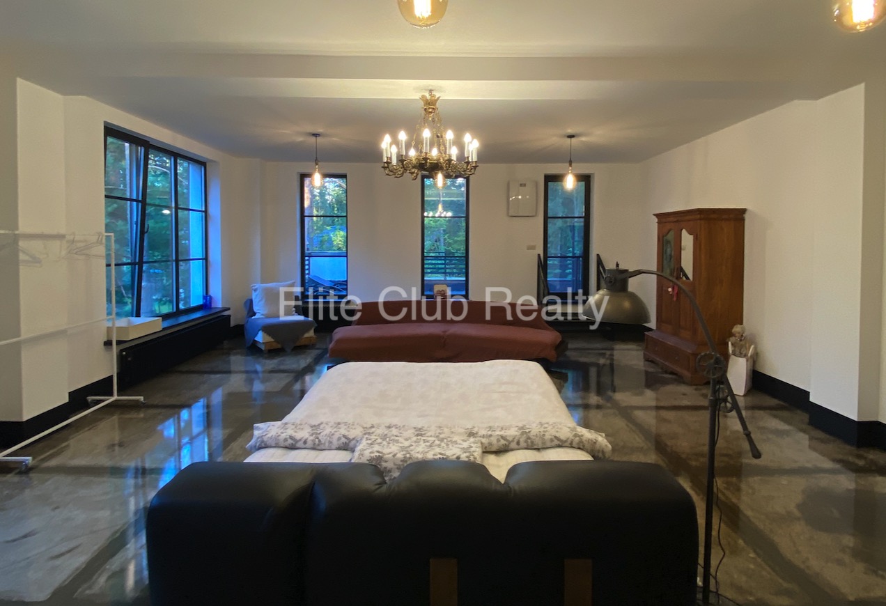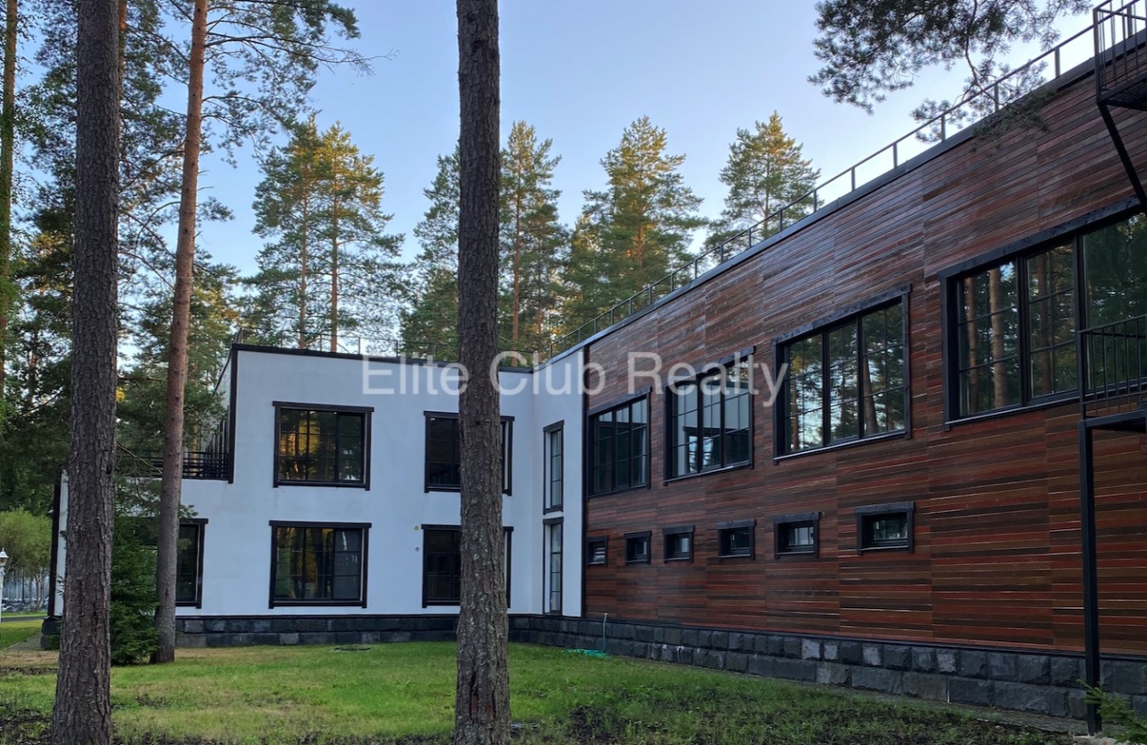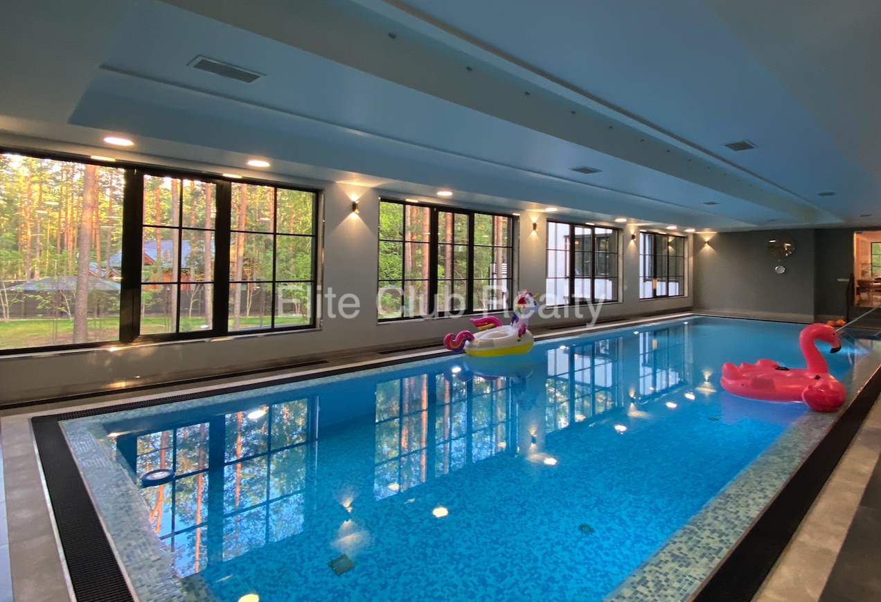 Планировка коттеджа: На первом этаже находится библиотека, гостиная, кухня-столовая, котельная, комната, два сан. узла. На втором этаже три спальни, кабинет, четыре сан. узла. В доме 25 метровый бассейн, все оборудование под него установлено, хамам. Также на территории земельного участка есть летний бассейн. Дом окружён лесом с чистейшим воздухом. Территория поселка огорожена высоким забором и находится под круглосуточным наблюдением профессионального охранного предприятия.