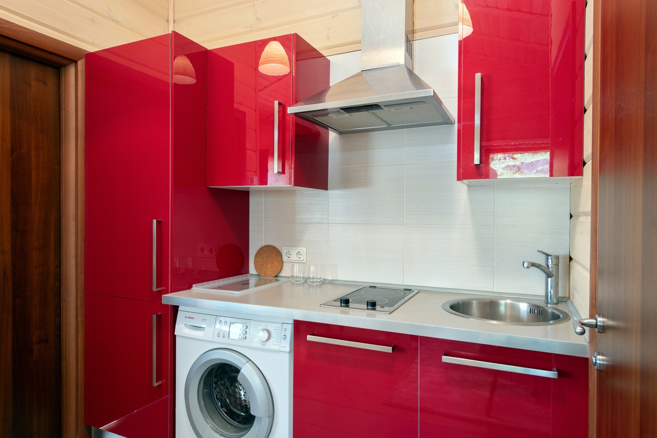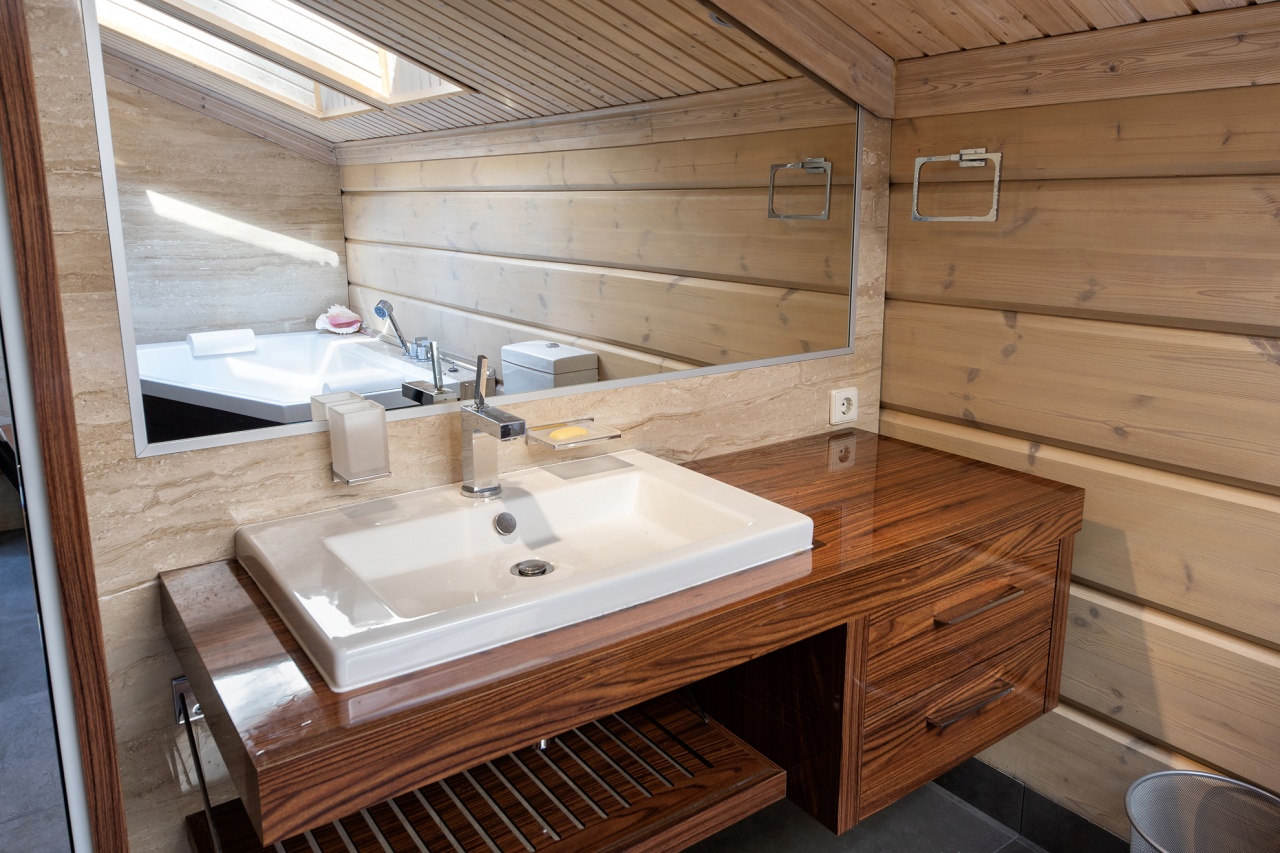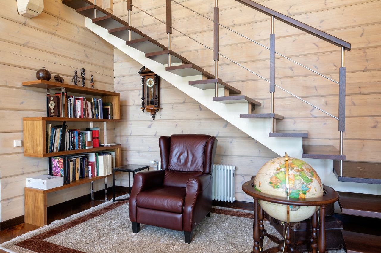 1 этаж — просторная гостиная, кухня-столовая с выходом на террасу, кабинет, спальня, санузел с сауной