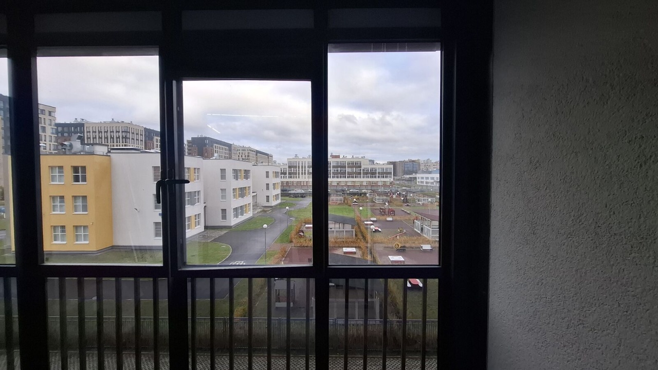 Окна кухни во внутренний двор, комната - на пешеходную дорожку без машин и детский сад.