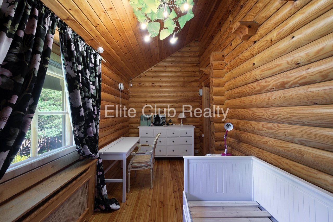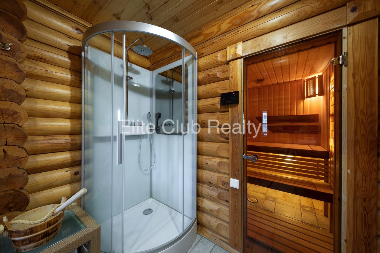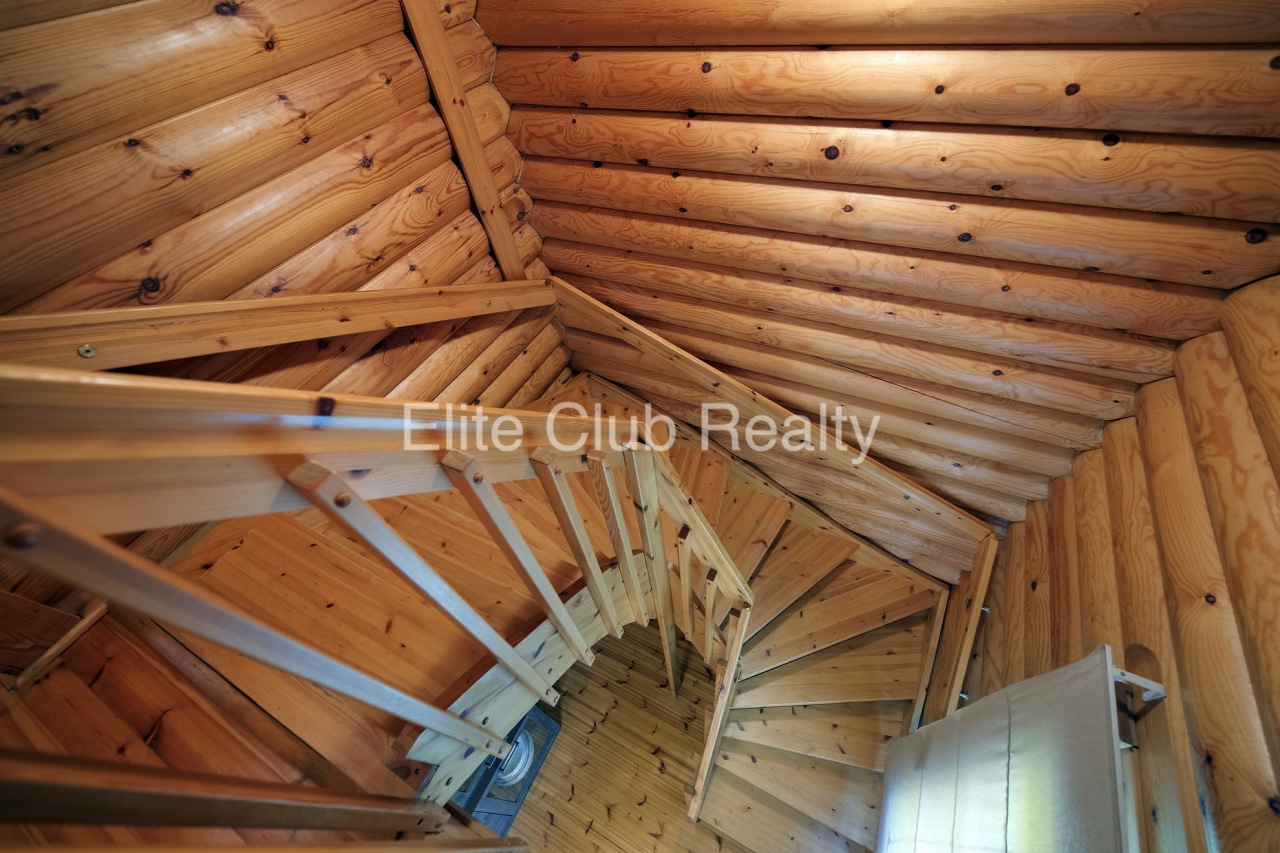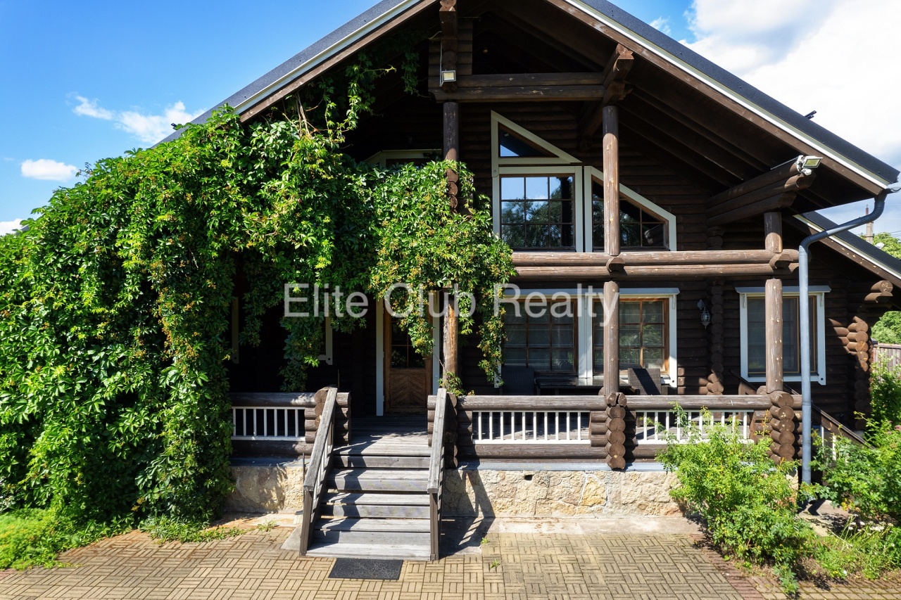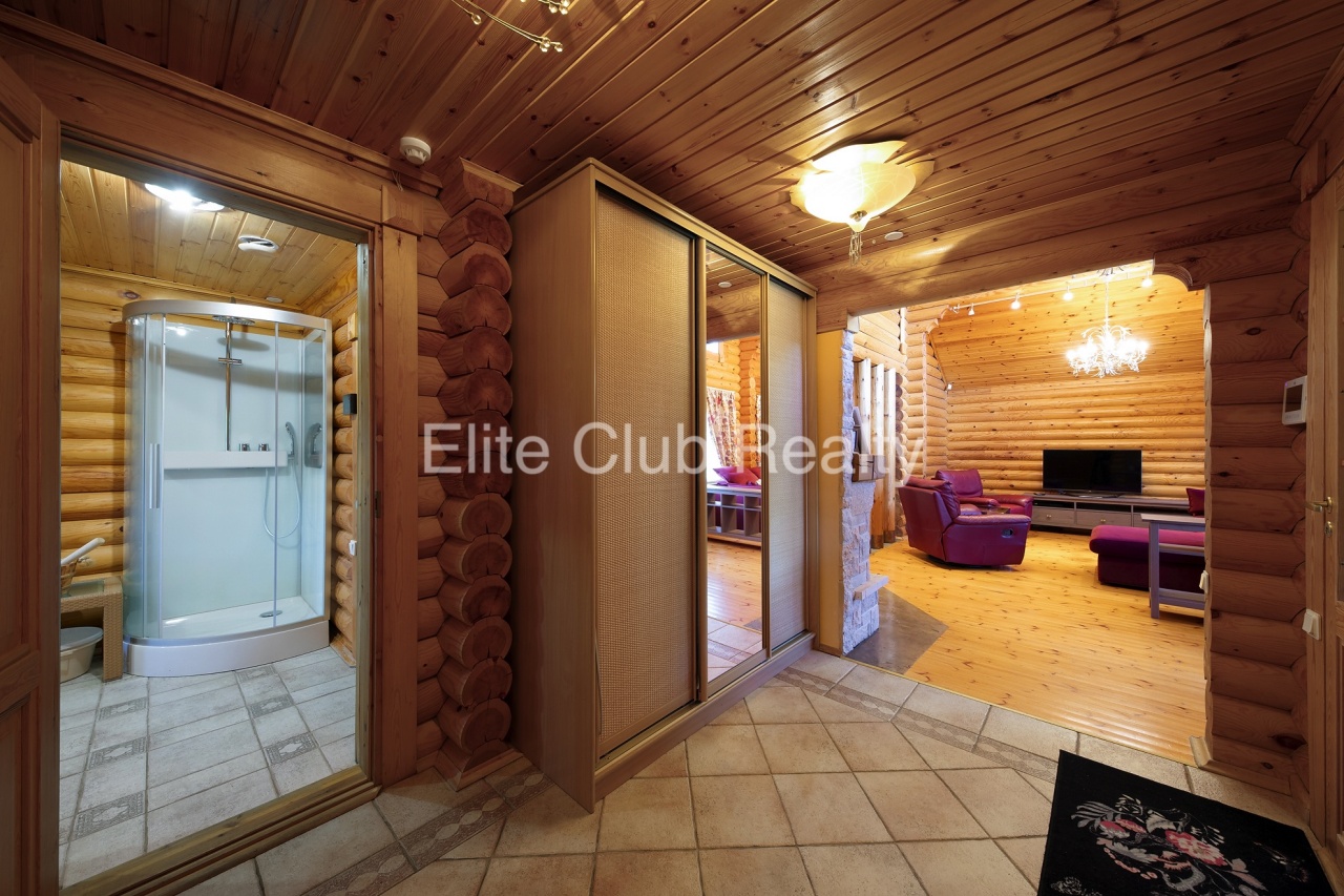 Основной дом, выполненный из финского бревна, находится на вершине участка и отличается компактной, но продуманной планировкой. На первом этаже расположены: