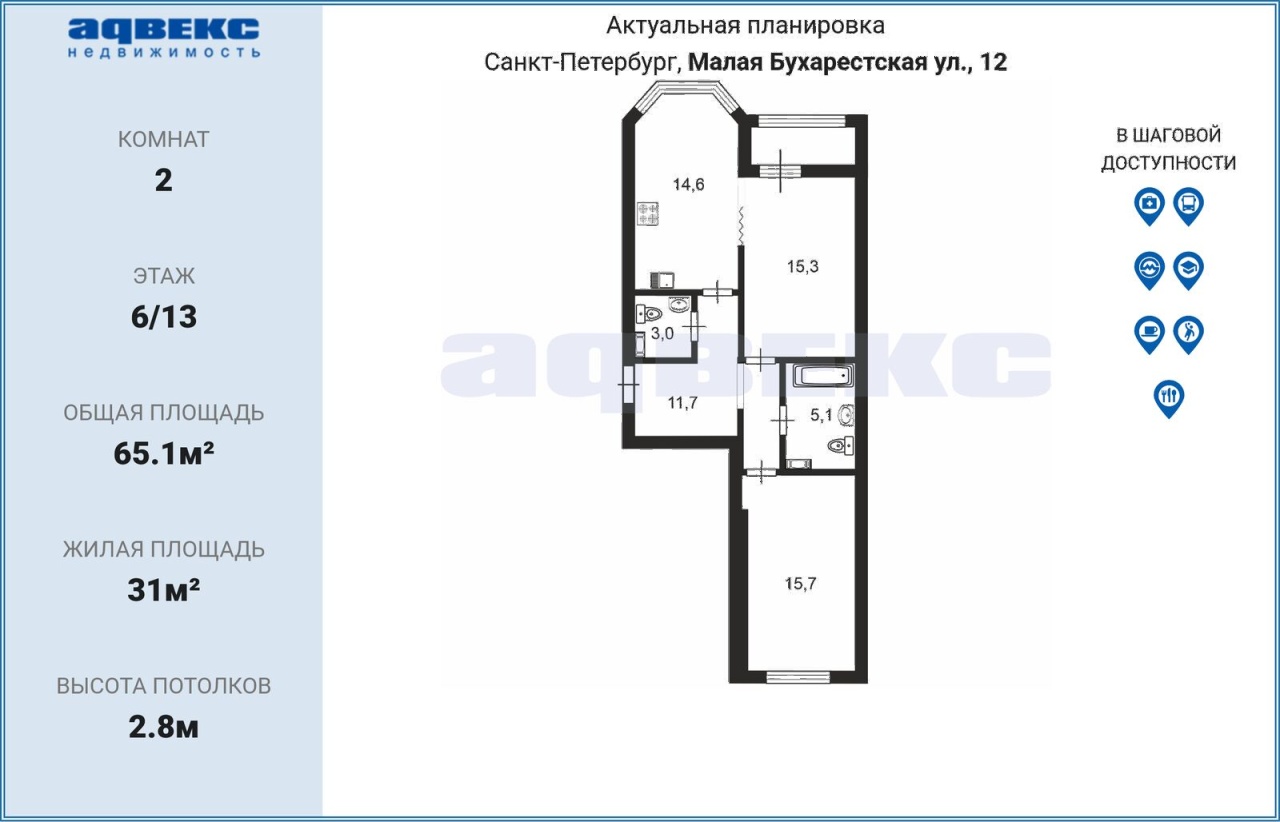 | Этаж | 6 | Общая площадь | 65.1 кв.м. |
