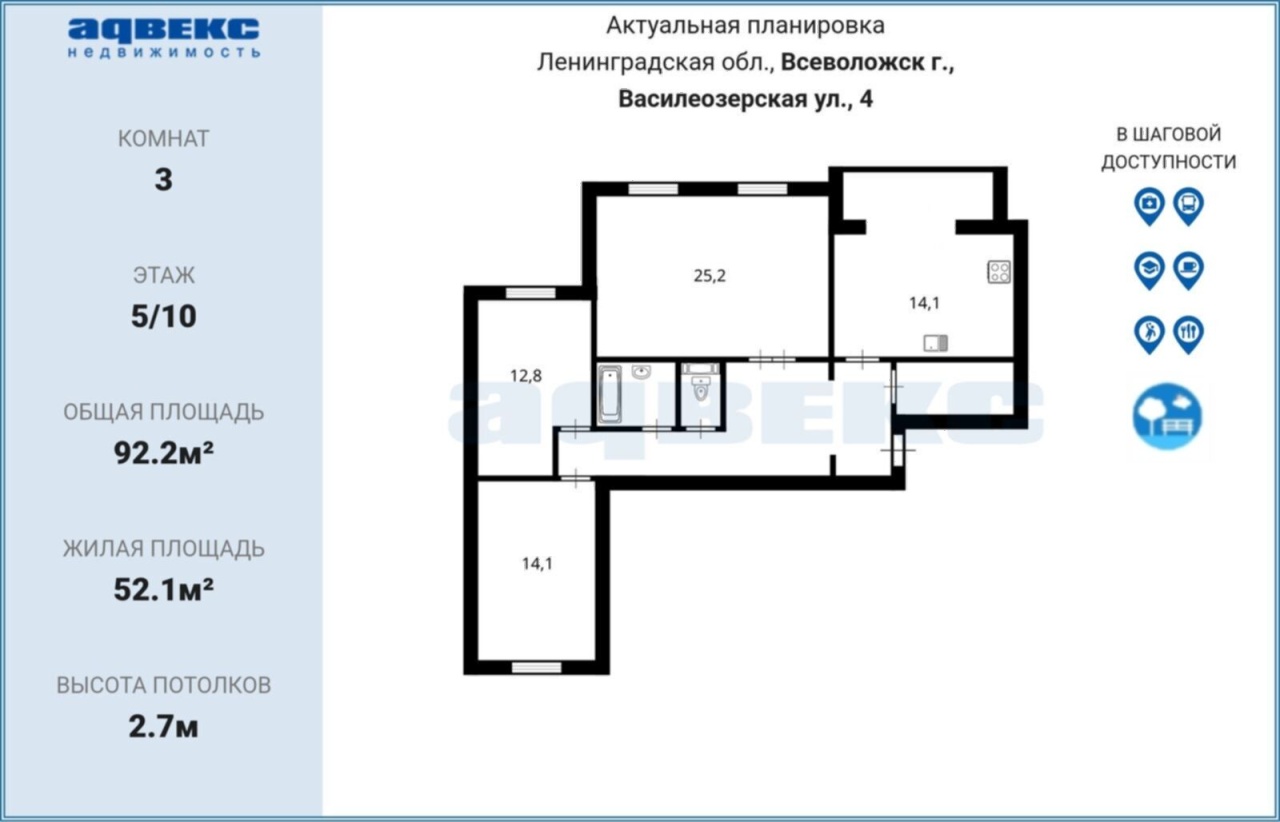 Большая кухня + ТРИ отдельных комнаты, нет проходных. 25.2 с двумя окнами + 14.1 + 12.8