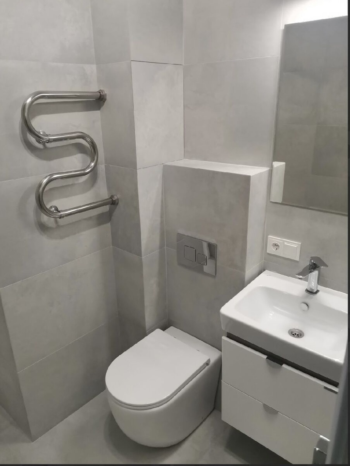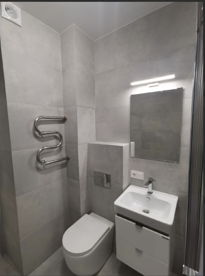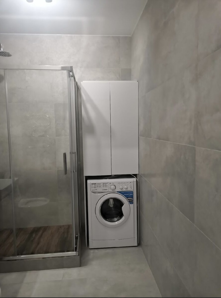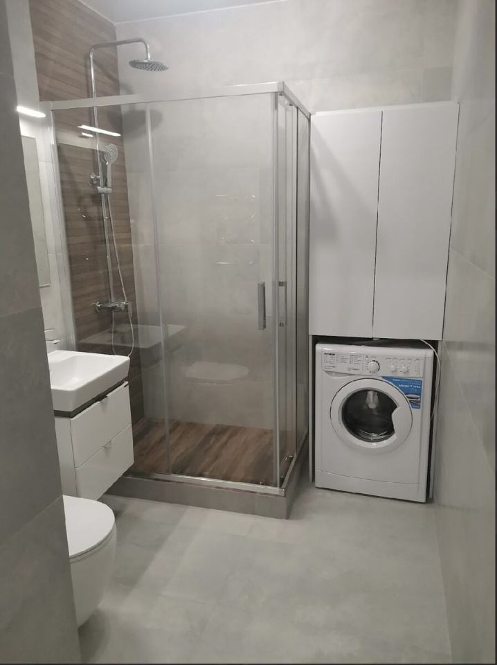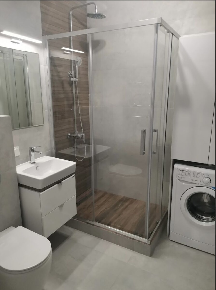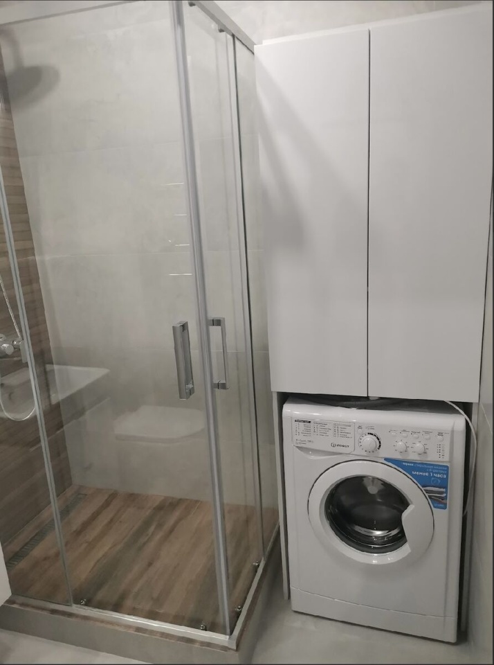 Большой совмещенный санузел с новой сантехникой и стиральной машиной.