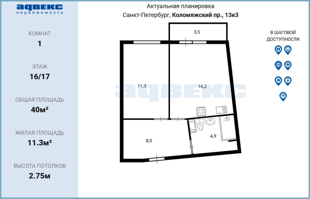 | Этаж | 16 | Общая площадь | 40 кв.м. |