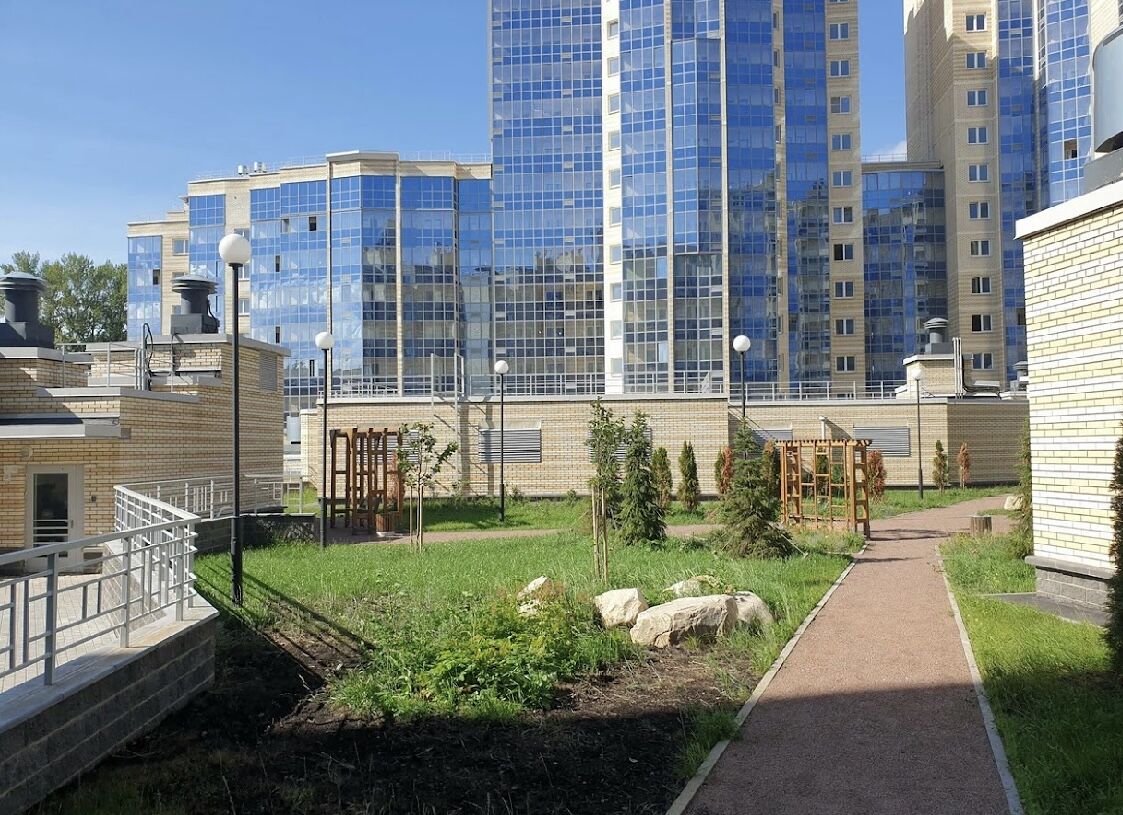 Приватный двор с ландшафтным зонированием находится под круглосуточным видеонаблюдением. Собственная инфраструктура включает подземный паркинг и детский сад на 75 мест.