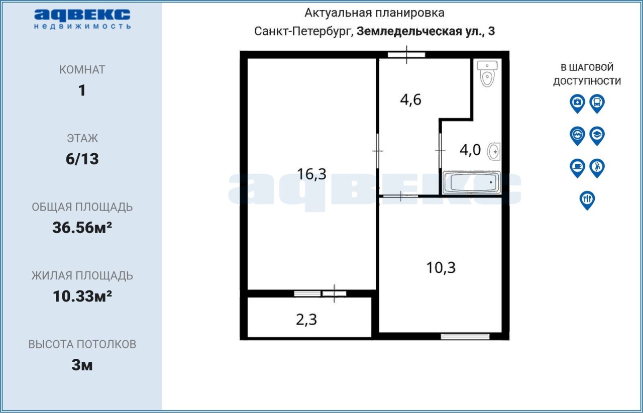 | Этаж | 6 | Общая площадь | 36.56 кв.м. |