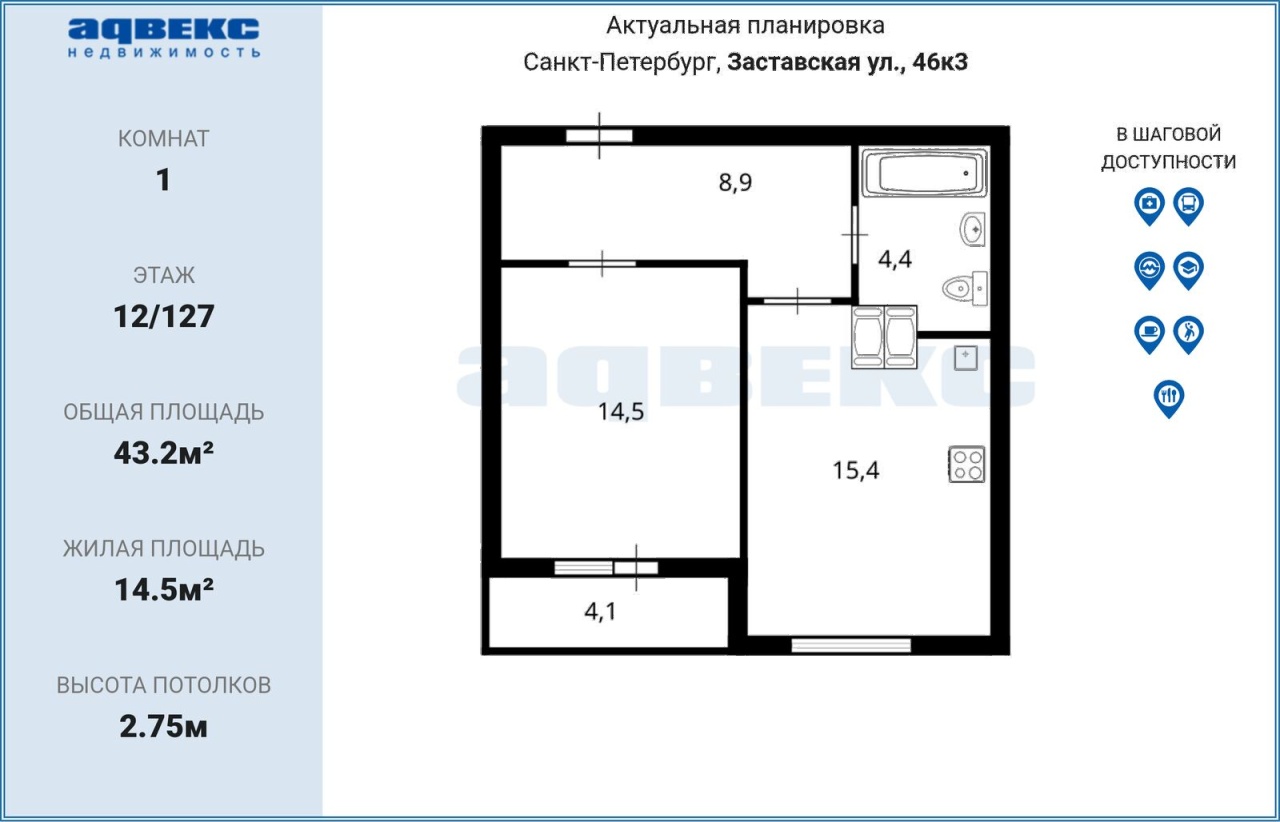 | Этаж | 12 | Общая площадь | 43.2 кв.м. |