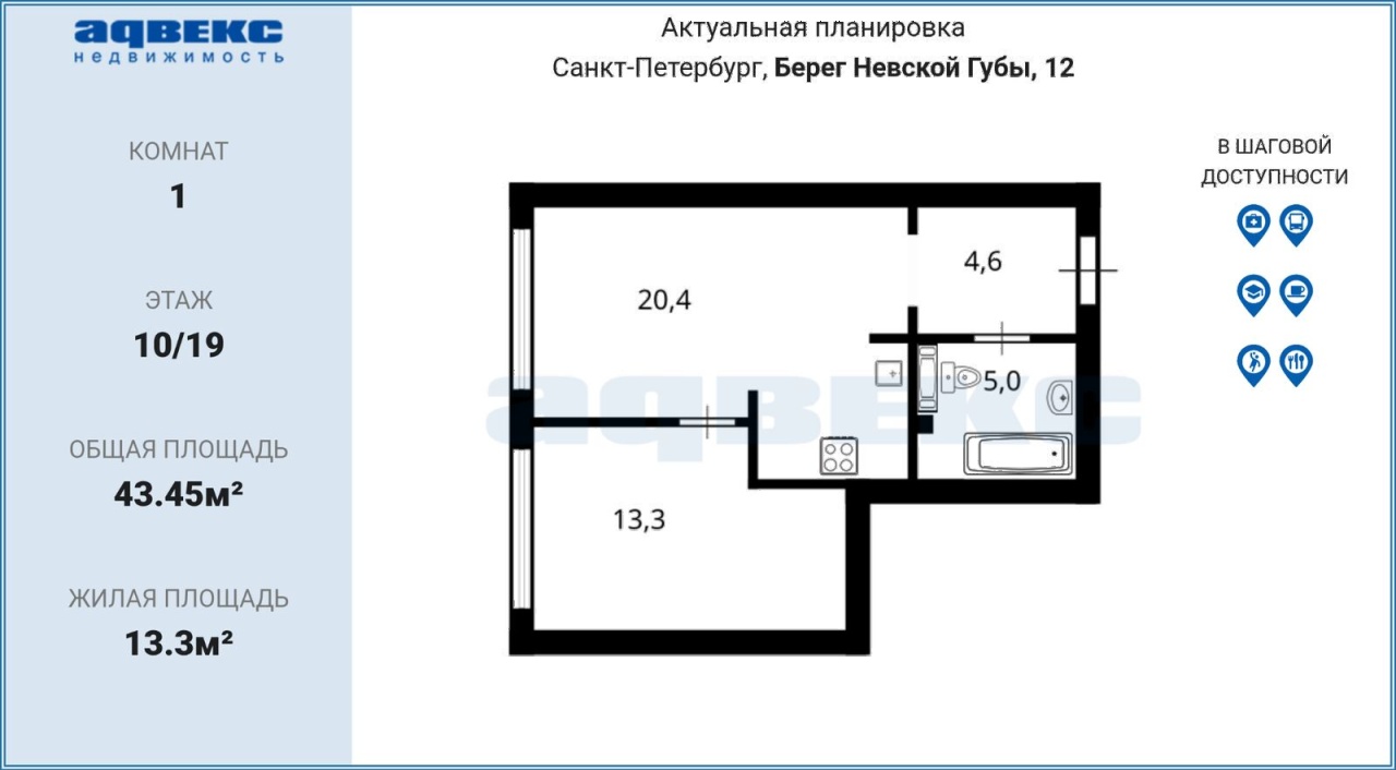 Жилая площадь 13.3 кв.м. Число комнат 1