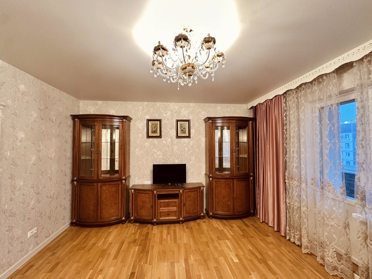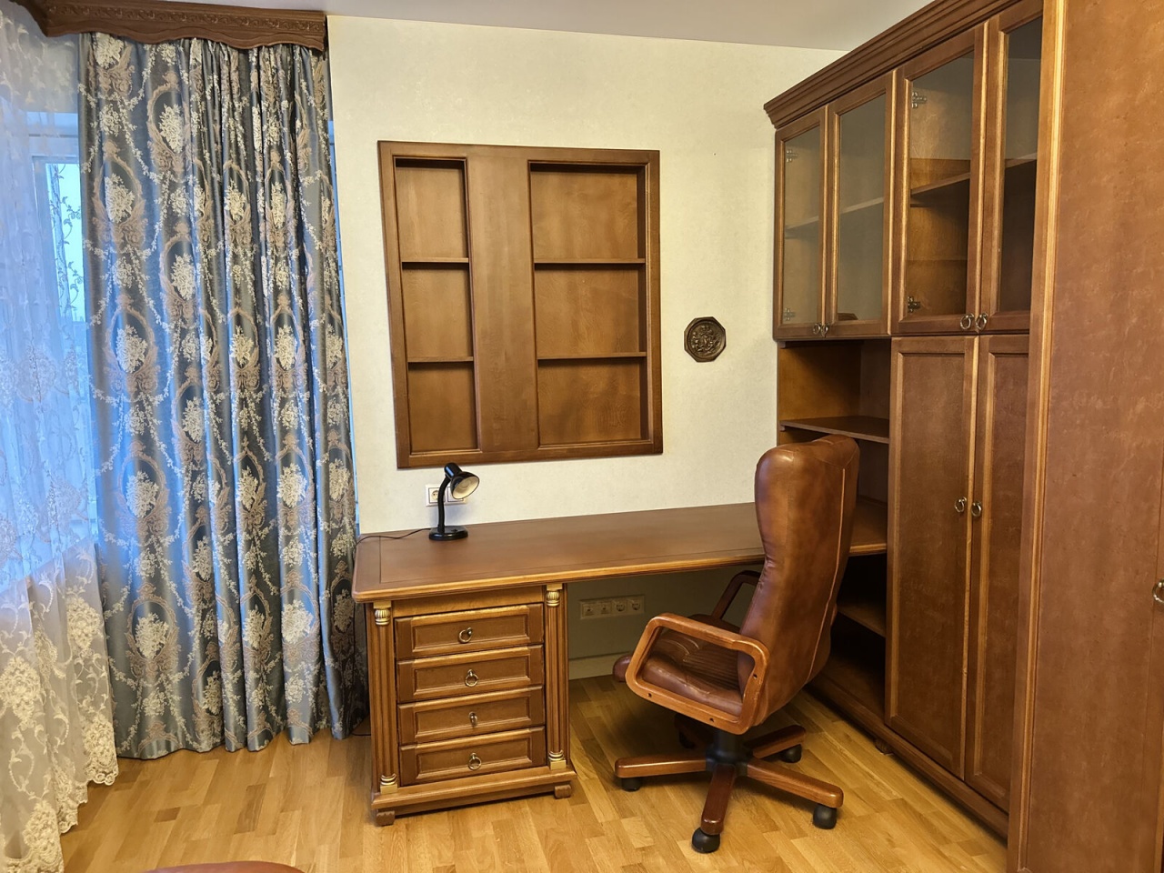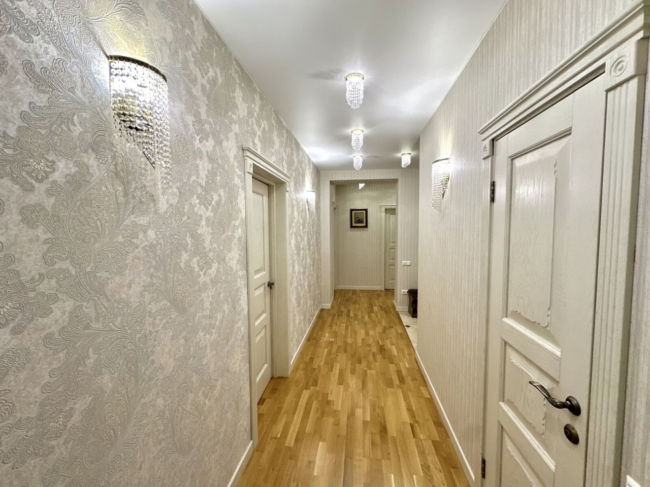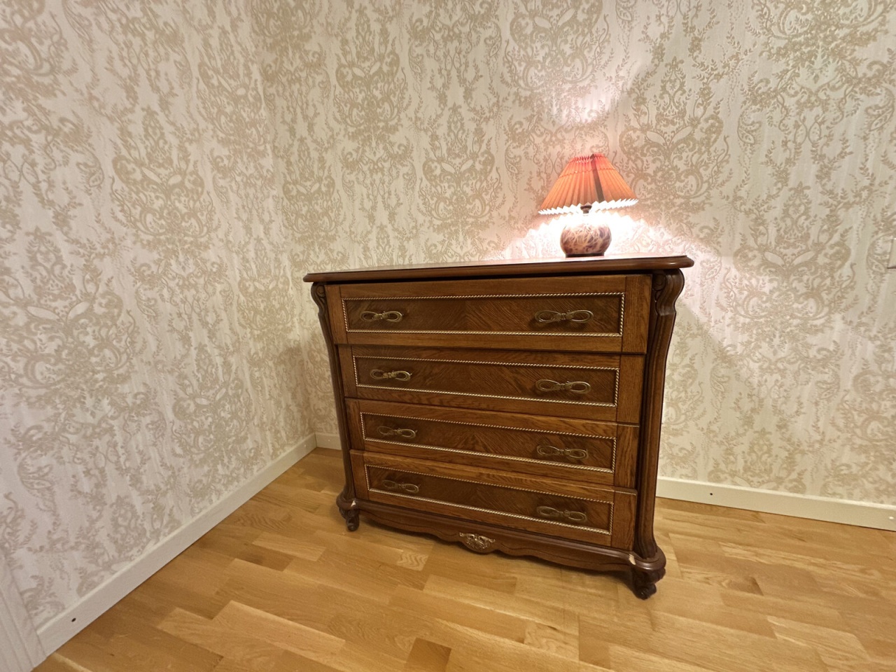 Ремонт выполнен в классическом стиле с использованием дорогих материалов. Настоящий массив дуба в мебели, паркетная доска под ногами, массивные межкомнатные двери для полной тишины и хрустальные светильники, наполняющие пространство изяществом.