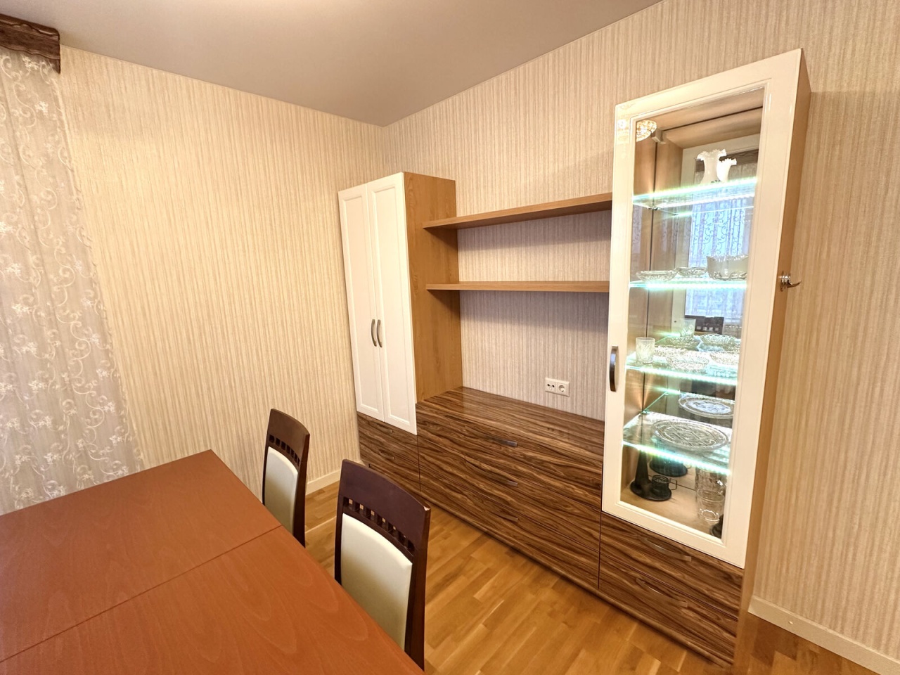 Гостиная (23 кв. м): Прекрасное место для отдыха и приема гостей. Кожаный раскладной диван, большой обеденный стол и витрины создают атмосферу уюта и гостеприимства.
