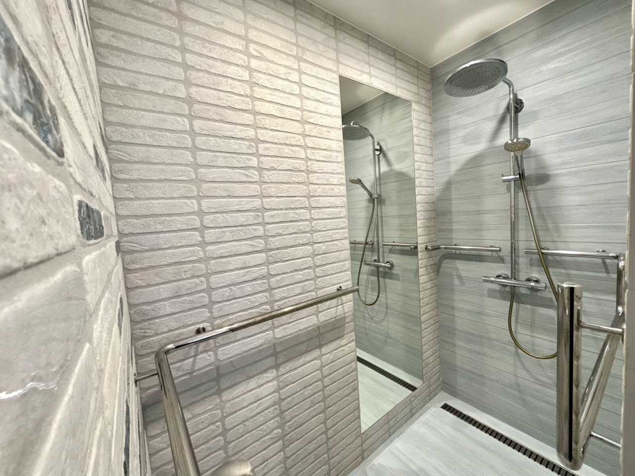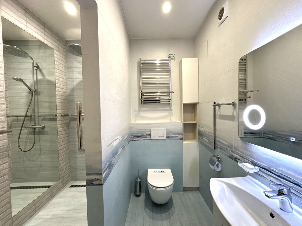 Два раздельных санузла: В каждый установлени унитаз и раковина. Один оснащен душевой зоной, а второй ванной с перилами, для вашего удобства и большим зеркалом.