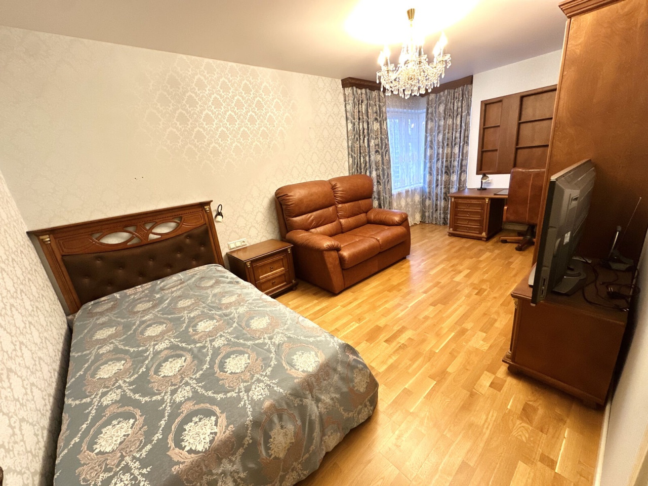 Спальня-кабинет (18 кв. м.) : совмещение зон для сна и работы. Есть все необходимое: комфортная кровать, диван, рабочий стол, шкаф и телевизор.