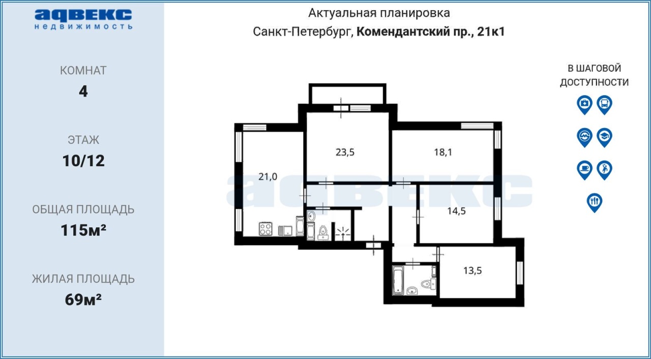Всего 10 минут пешком до метро «Комендантский проспект».