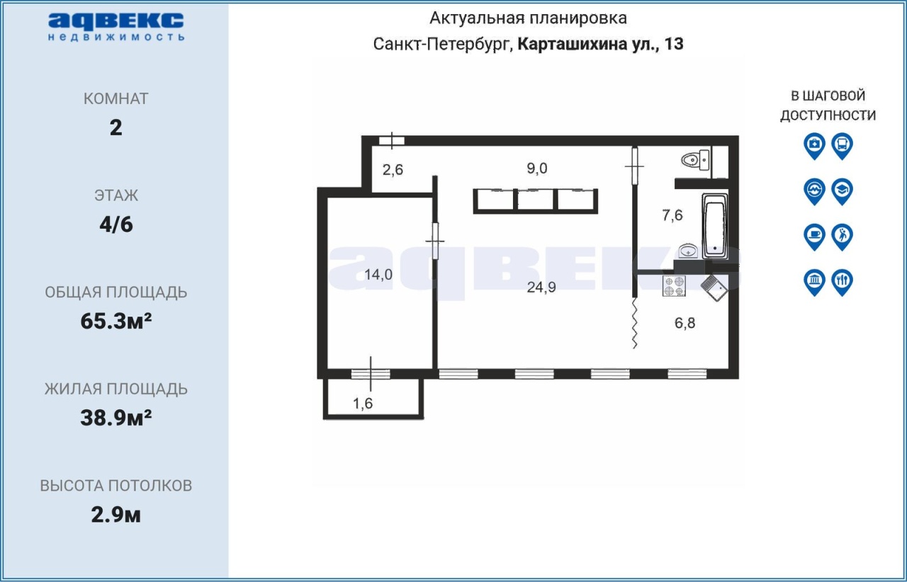 • Площадь: Общая — 65.3 кв. м, жилая — 38.9 кв. м.