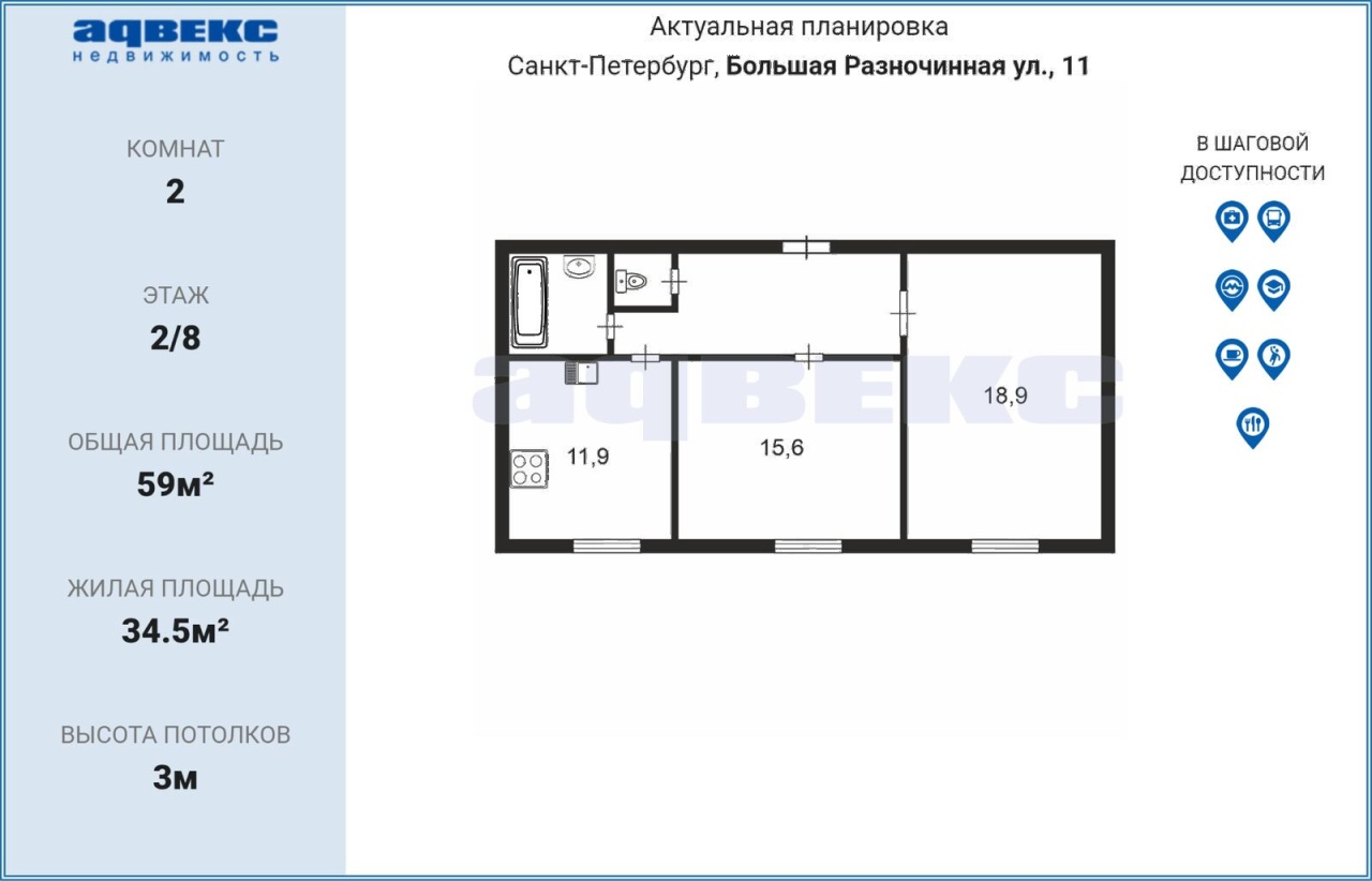 Жилая площадь - 34.5 кв. м (15.6 + 18.9)