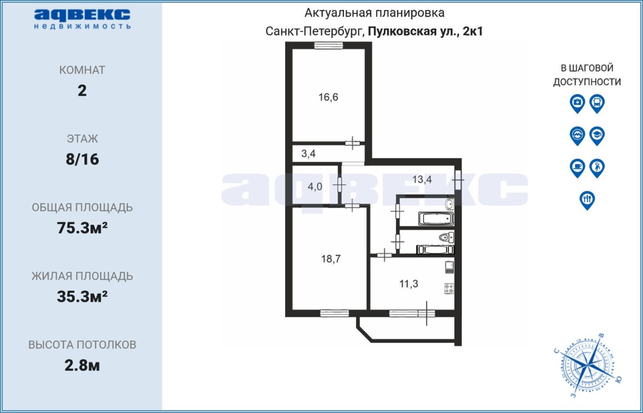 | Этаж | 8 | Общая площадь | 75.3 кв.м. |