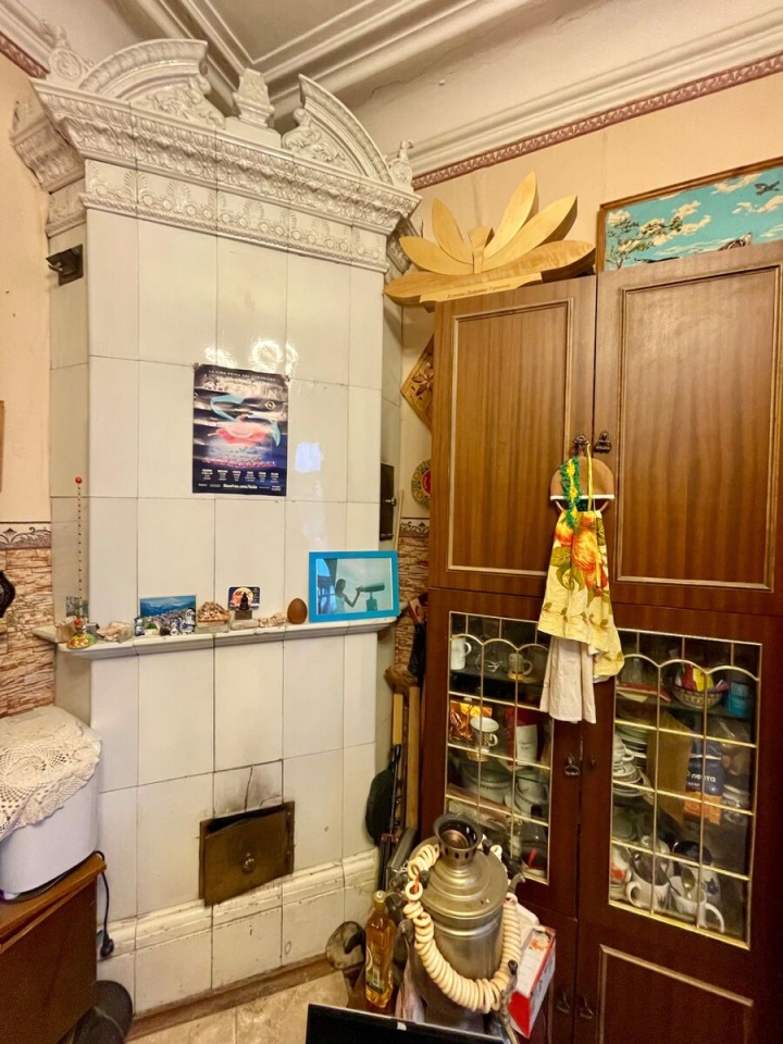 Квартира с классической двухсторонней планировкой и двумя входами. В одной из комнат есть балкон с кованой чугунной решеткой и козырьком. И также в одной из комнат есть кафельная печь.
