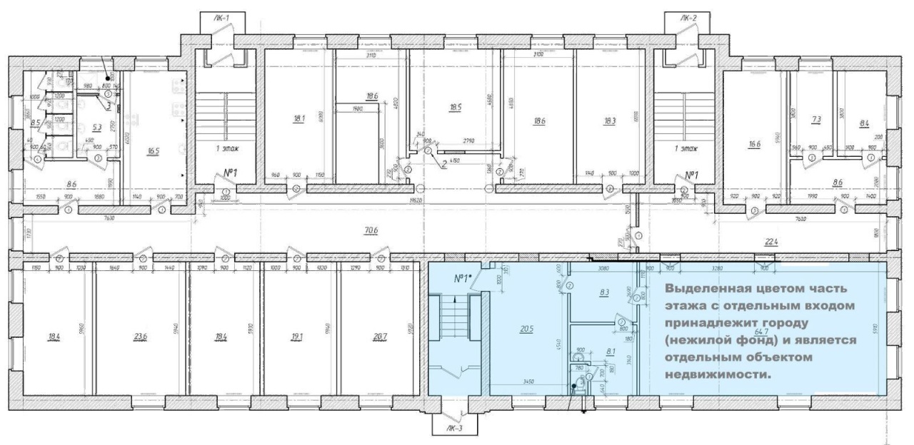 К продаже предлагается коммунальная квартира с окнами на три стороны в доме сталинской эпохи 1954 г. п. (бывшее общежитие). Поскольку продаваемый объект занимает почти весь первый этаж и имеет по плану два крыла и два входа, он прекрасно подойдет под любые бизнес-цели: это может быть как представительский офис, так и апартаменты или мини-отель. На плане выделенная цветом часть этажа - городское имущество, переведенное в нежилой фонд, является отдельным объектом недвижимости.