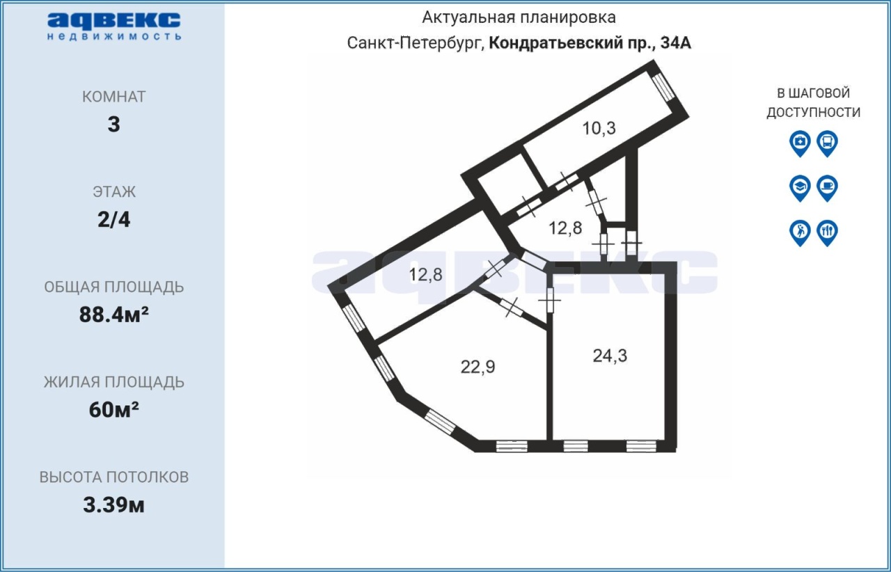 | Этаж | 2 | Общая площадь | 88.4 кв.м. |