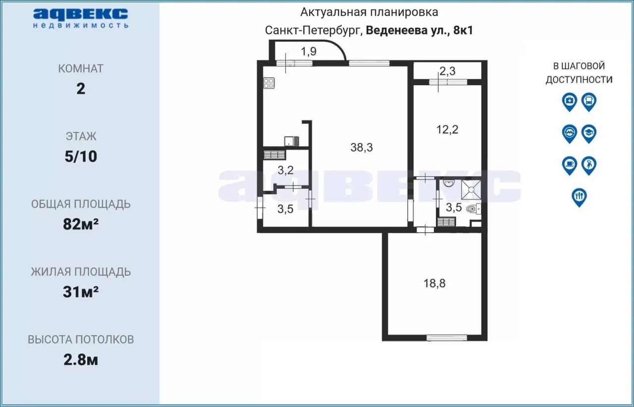Предлагается к продаже 2-комнатная квартира общей площадью 82 кв. м, расположенная по адресу: Санкт-Петербург, Калининский район, улица Веденеева, дом 8. Район отличается развитой инфраструктурой и удобной транспортной доступностью, включая близость станции метро «Политехническая», которая находится в пешей доступности или в 5 минутах на транспорте.