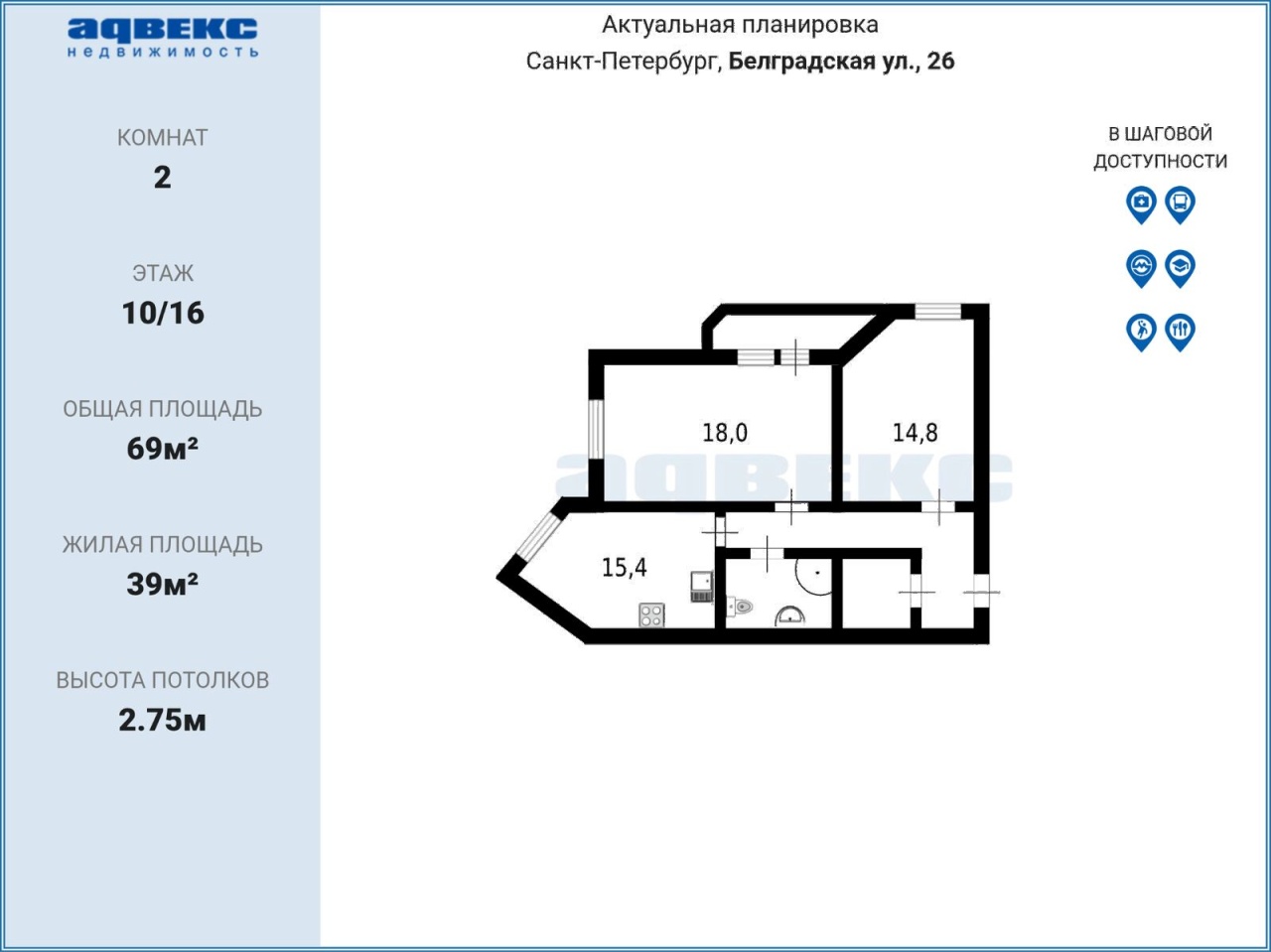 | Этаж | 10 | Общая площадь | 69 кв.м. |