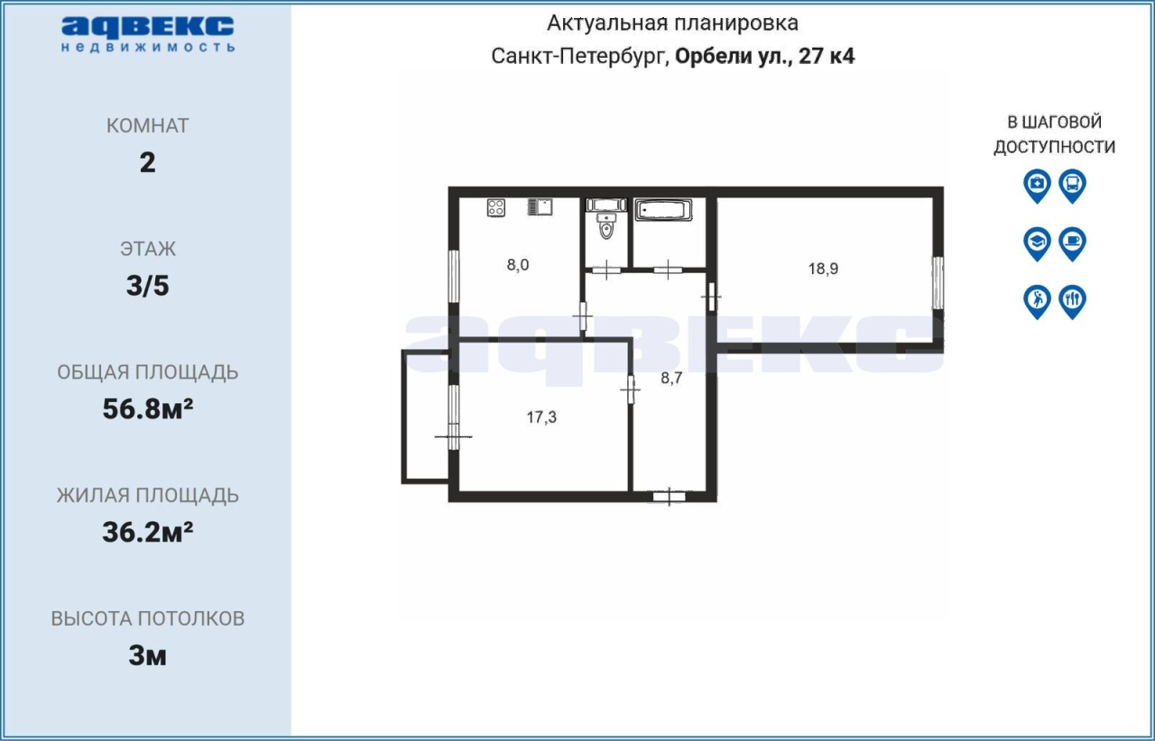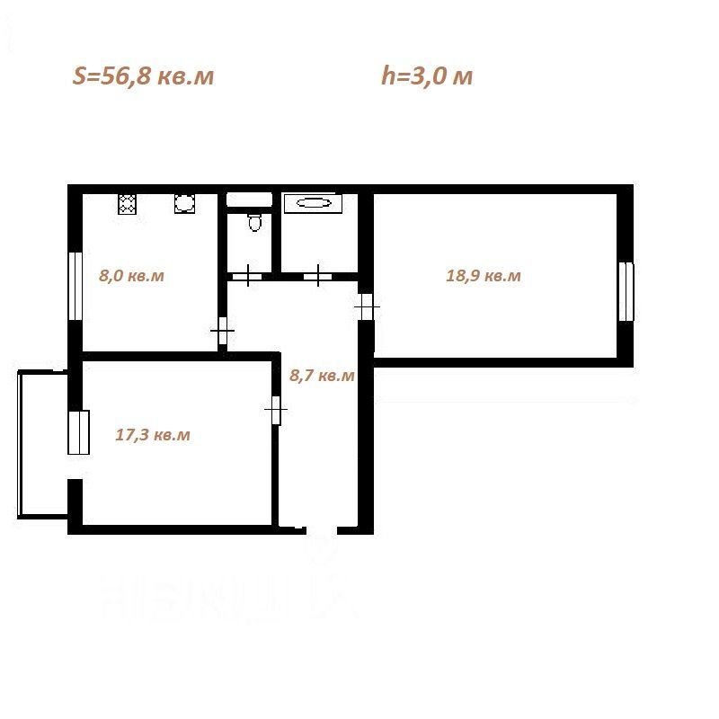 | Этаж | 3 | Общая площадь | 56.8 кв.м. |